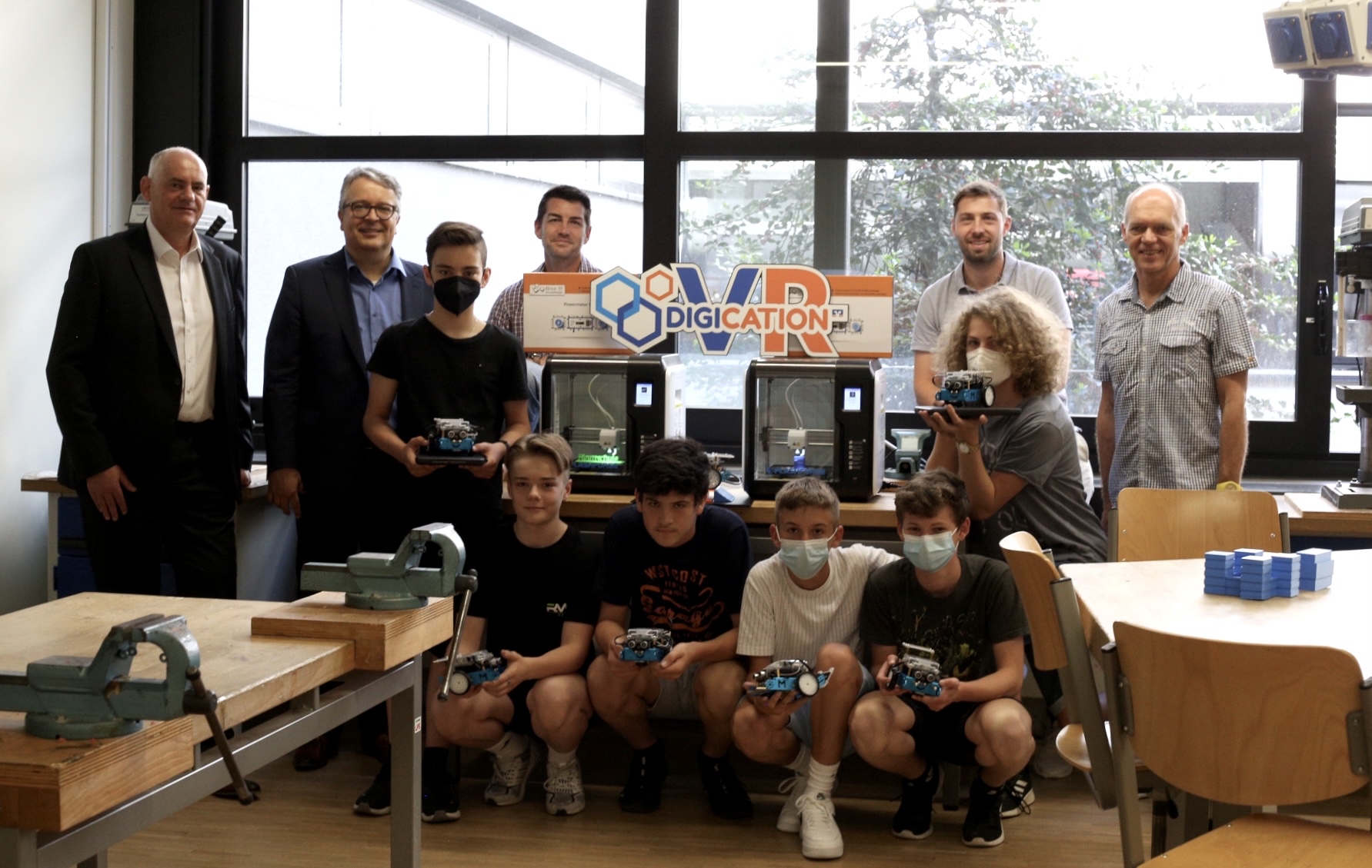 Stolz und freudig präsentierten Schülerinnen und Schüler sowie Lehrer der MINT-Fächer am Gymnasiums der Heimschule St. Landolin, welche Möglichkeiten ihnen im Unterricht nunmehr geboten sind. Das Bildungsförderungsprojekt „VR-Digication“ der Genossenschaftsbanken ermöglichte ihnen die Anschaffung zweier 3-D-Drucker, zehn programmierbarer Roboter sowie von zehn elektronischen Steckbrettern. Für die Förderung der Anschaffungen in Höhe von 7.500 Euro bedankten sich Schulleiter Eberhard Pfister, die Lehrkräfte Dominique Stolz (NWT), Reinhard Kastner (Physik) und Benedict Konrad (IMP) bei einer Dreier-Delegation der Volksbank Lahr, bestehend aus Vorstand Reiner Richter, Marketing-Leiter Dieter Leidinger und Susanne Hauser (Kommunikation).