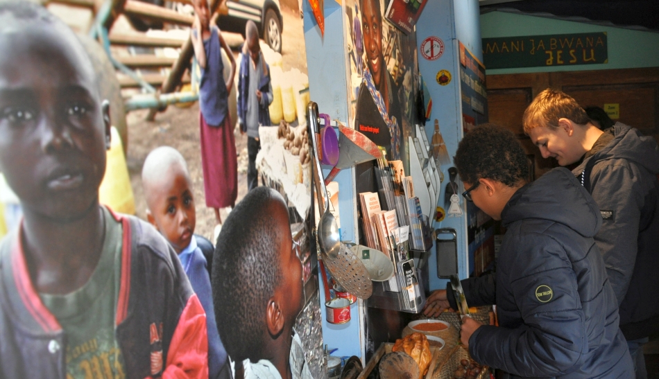 dsc_0234_0.jpgAnschließend besuchen die Schüler die Ausstellung im Missio-Truck selbst. Der kleine Rundgang ermöglicht einen ziemlich authentischen Perspektivwechsel in die Rolle eines kongolesischen Flüchtlings. Das Szenario beginnt auf einem Markt – doch plötzlich fallen Rebellen über das Dorf her. Schnell müssen sich die Schüler entscheiden, was sie mitnehmen: Kleidung, Adressbuch, Handy? Während der folgenden Simulation erlebt man, welche Folgen eine Fehlentscheidung hier haben kann. In der nächsten Stadt ist es unmöglich, eine Arbeit zu finden, hat man seine Zeugnisse nicht dabei. Und die Weiterreise in ein anderes Land? Nahezu ausgeschlossen, wenn man im Kampfgetümmel seinen Pass nicht mitgenommen hat. So lernt man in dieser Ausstellung, die Welt durch die Augen eines Flüchtlings zu sehen und erfährt nebenbei interessante Details über die Situation von Flüchtlingen auf der ganzen Welt.