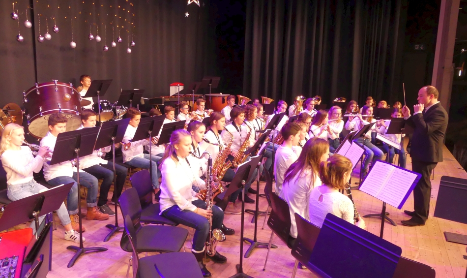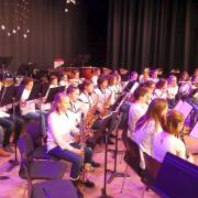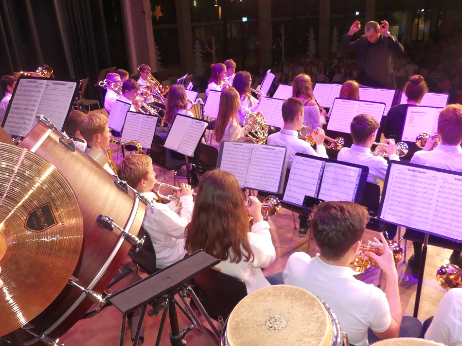 Eine weihnachtliche und winterliche Dekoration von Bühne und Aula, schick gekleidete Schüler mit Ihren gold- und silberglänzenden Instrumenten und vor allem eine begeisternde Musik der vier Bläserklassen – die Einstimmung auf die kommende Weihnachtszeit hätte nicht besser gelingen können. Nicola Heckner konnte erstmals in ihrer neuen Funktion als Schulleiterin der Realschule die Gäste in der vollbesetzten Aula zum Winterkonzert der Bläserklassen begrüßen. Nach drei intensiven Probentagen, auch mit der australischen Gastdirigentin Dee Boyd, begeisterten die Schülerinnen und Schüler der Bläserklassen das Publikum.