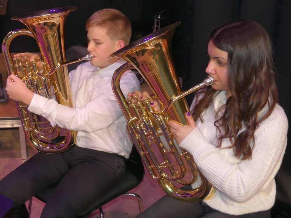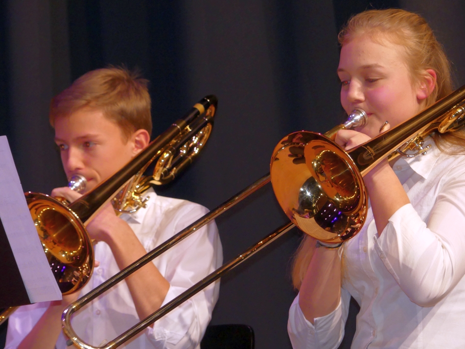 Den musikalischen Reigen eröffnete die Bläserklasse R7b mit den Stücken „Tyrannosaurus Charlie“ und mit „A Blues to grow on“. Für besonderen Übungsfleiß ernteten die Solisten Johannes Isele, Felix Breithaupt, Maxi Rommel und Florian Fischer den verdienten Applaus von Mitschülern und Verwandten. Der Bläserklassenlehrer Tobias Schulz und seine Musikkollegen waren von der Leistung der Klasse, die seit nur zwei Jahren gemeinsam musiziert, besonders beeindruckt.