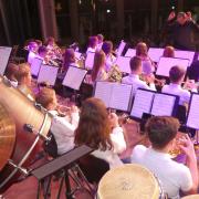 Charmante Ansagerinnen erläuterten die drei Musikstücke, die die R8b mit ihrem Dirigenten Markus Albu zum Besten gab. Der „Raiders March“ ging dem Publikum schnell ins Ohr und wurde schnell als Titelmelodie des Films „Indiana Jones“ erkannt. „Shackelford Banks“ kannten zumindest die langjährigen Konzertbesucher als Standardstück der Bläserklassen. Die Musik ist stark von Westernklängen beeinflusst und man konnte sich die Wildpferde auf einer unbewohnten Insel sehr gut vorstellen. Der „Soul Bossa Nova“ wurde auch durch die Soli von Jana Gäßler und Felix Schillinger an ihren Saxophonen zum musikalischen Ohrwurm.