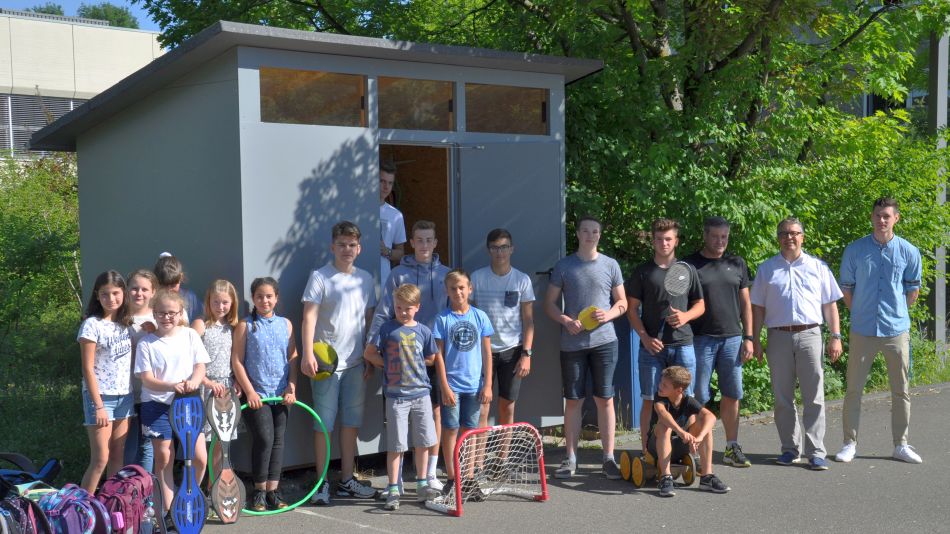 Bereits die alte Hütte war bei den Schülerinnen und Schülern sehr beliebt, da man hier viele Spiel- und Sportgeräte für den Schulhof ausleihen konnte, bis der Zahn der Zeit aber so heftig an ihr genagt hatte, dass sie erneuert werden musste. Christian Winterer entwarf und baute die neue Hütte in Ständerbauweise zunächst in der Werkstatt, bevor er über mehrere Tage die alte durch die neue Hütte ersetzte. Bei dieser Gelegenheit wurden für etwa 300 Euro die vorhandenen Bälle, Tore, Hüpfseile, Waveboards, Pedalos und noch vieles mehr erneuert und ergänzt. Gesamtleiter Eberhard Pfister dankte bei der offiziellen Eröffnung Christian Winterer und Sportlehrer Simon Bury, der die Erneuerung der Hütte vonseiten Sportfachschaft begleitete.