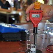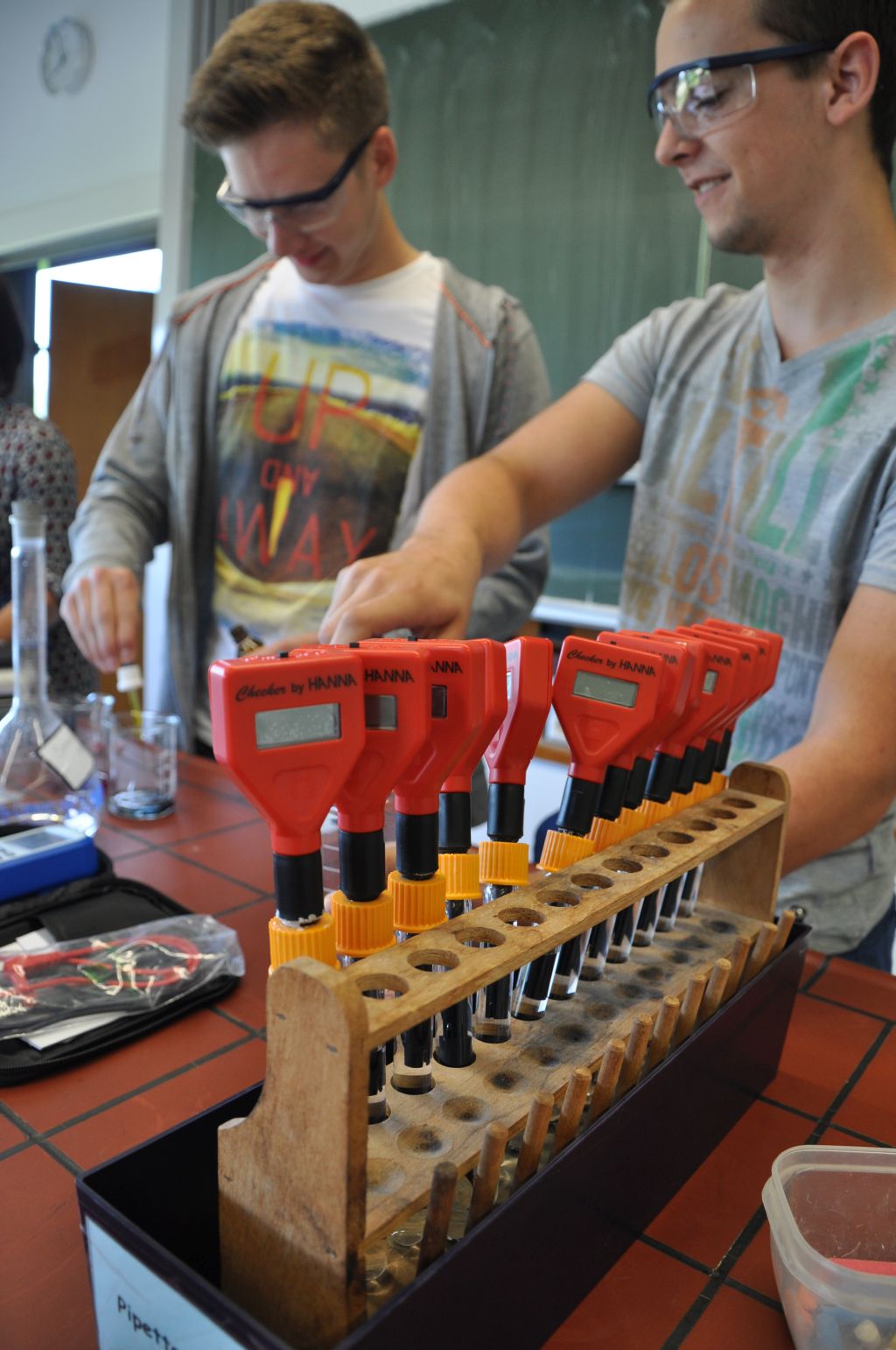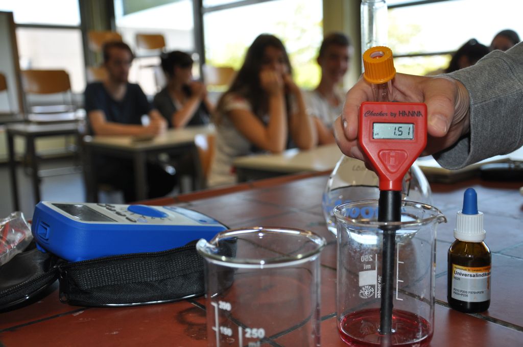 Durch die großzügige Förderung des Fonds der Chemischen Industrie konnten wir wiederholt Laborgerätschaften für das Praktikum wie Messgeräte, Büretten, Magnetrührer u.v.m. anschaffen. Neu angeschafft in diesem Jahr haben wir einen „Teachers Helper“, mit dem Messwerte und Übungen auf Smartphones der Schüler gesandt und dort mittels einer App bearbeitet werden können. Für das Praktikum haben wir pH-Meter angeschafft, mit denen sich einfach und exakt pH-Werte ermitteln lassen – mit den bereits angeschafften Büretten und Magnetrührern sind wir für Titrationen (Wie viel Säure ist im Essig?) nun bestens ausgerüstet. Die neuen Multimeter ermöglichen das Erfassen zahlreicher Messdaten und das Polarimeter für den Overheadprojektor ermöglicht das Messen und Veranschaulichen der optischen Aktivität (hat mit der links- oder rechtsdrehenden Milchsäure zu tun, kennt man von den Angaben auf dem Joghurtbecher…).