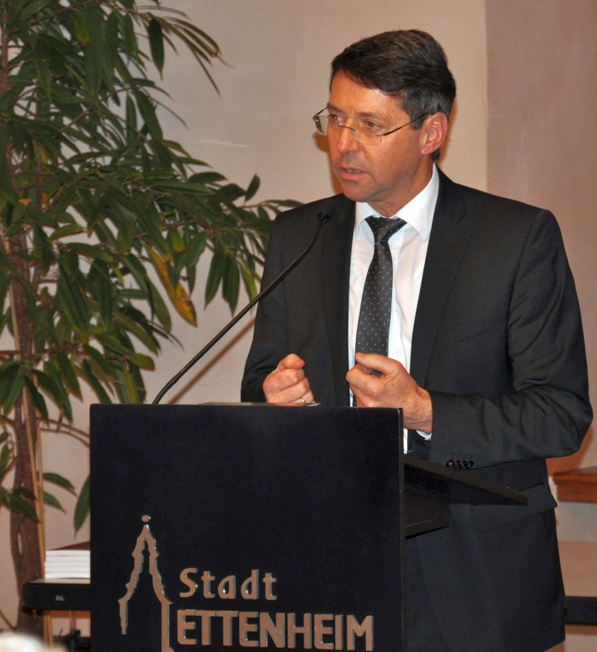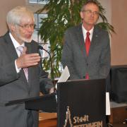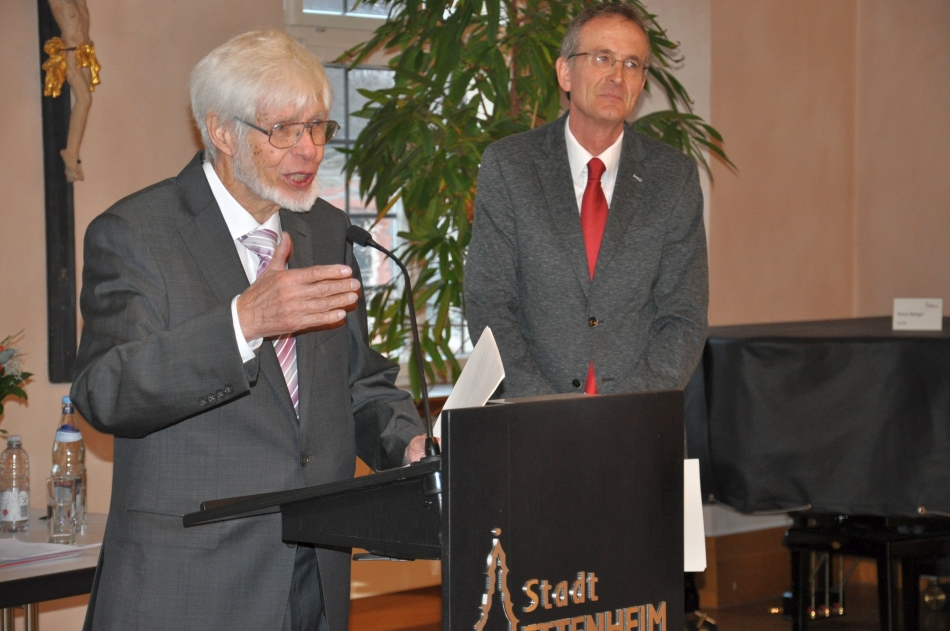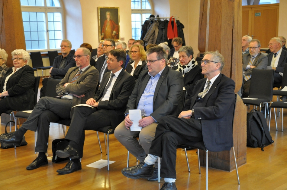Sehr persönlich würdigte Stiftungsdirektor Dietfried Scherer diese Leistung. Er berichtete von der Akribie und Ausdauer, mit der sich Bernhard Uttenweiler der Quellenrecherche unter anderem in den Archiven der Schulstiftung gewidmet habe, aber auch von der Umsicht und Empathie, die er am damaligen stellvertretenden Schulleiter geschätzt habe, als Scherer selbst in den 1980er Jahren als Lehrer in Ettenheim unterrichtet habe. Die Beziehung der Schulstiftung zu den Lehrbrüder verglich er mit der Beziehung zwischen Großeltern und Enkeln, die eine sehr persönliche sei. Mit Blick auf den Grundgedanken, in der Heimschule St. Landolin christliche Bildung und Erziehung zu verwirklichen, sprach er den Lehrbrüdern zu: „Auf diesem Fundament stehen wir.“ Hier schloss sich Ettenheims Bürgermeister Bruno Metz an, der es für wertvoll hält, sich auch im politischen Tagesgeschäft immer wieder dieses Grundgedankens bewusst zu werden. Die katholische Kirche leiste mit den Kindergärten und der Heimschule einen unschätzbar wertvollen Beitrag zum gesellschaftlichen Leben der Stadt Ettenheim. Zudem verwies er auf die zahlreichen Kooperationen von Stadt und Schule, etwa bei Veranstaltungen in der Aula oder – ganz aktuell – bei der Errichtung der neuen Solarthermieanlage. Bezugnehmend auf Dietfried Scherer resümierte er für die Stadt Ettenheim: „Hier treffen die Generationen der Heimschule aufeinander; wir sind froh, dass wir das Haus sind, in dem diese Generationen wohnen.“