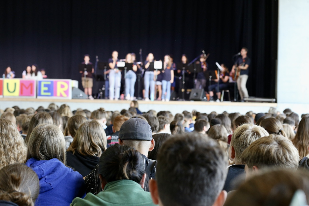Wie in jedem Jahr fand zum Ausklang des Schuljahres ein Gottesdienst statt, welchen die Religionslehrerinnen und -lehrer mit Schülerinnen und Schülern zusammen vorbereitet hatten. Für diesen kamen alle Mitglieder der Heimschulgemeinde in die Aula und machten so die Heimschulgemeinschaft intensiv spürbar.