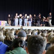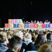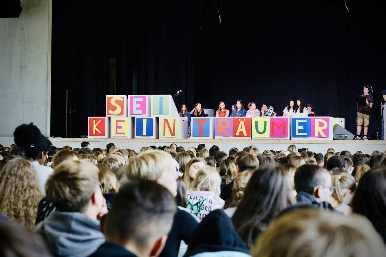 In einem Anspiel erinnerten Schülerinnen und Schüler aus der G7a/b an typische Unterrichtsszenen, in denen Schülerinnen und Schüler dafür kritisiert werden, dass sie im Unterricht vor sich hinträumen. Bunte Buchstaben auf Holzkisten, erstellt im Kunstunterricht bei Simone Liebherr, zeigten passend dazu den Schriftzug „Sei kein Träumer“.