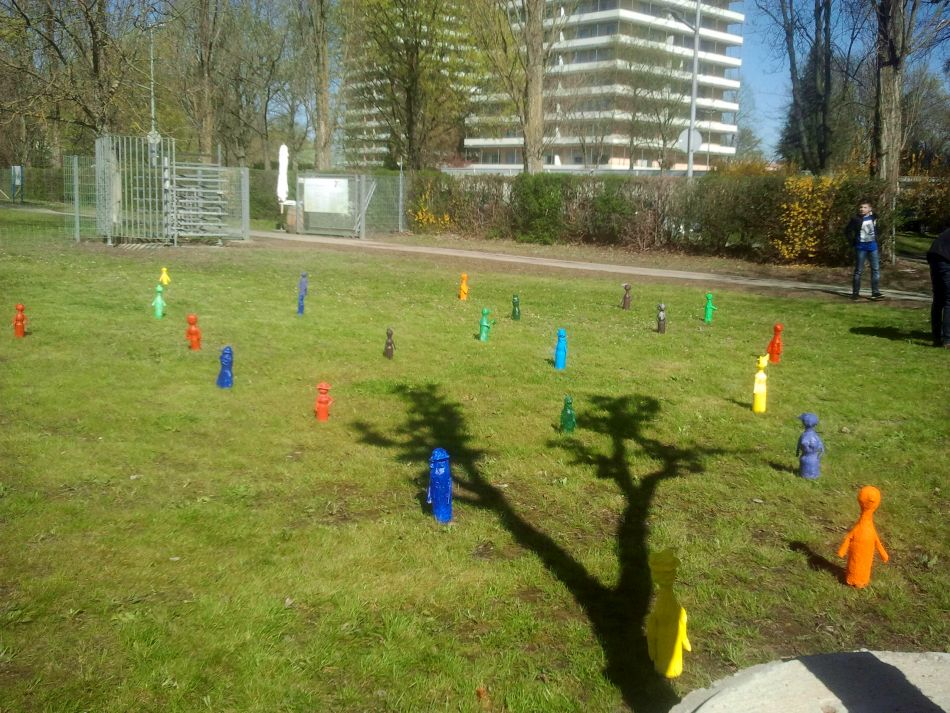 Hier streben die bunten Flaschenmenschen der Klasse R7a von Sabine Wagner, zum Teil halb in der Erde vergraben, auf den Blütenbaum der Kunst -AG von Anita Gast zu. Mit Papier, Kleister und Farbe haben die Siebtklässler Flaschen in phantasievolle Flaschenmenschen verwandelt. Die Idee dazu lieferte die Installation „Another Place“ des englischen Bildhauers Anthony Gormley: 100 gusseiserne Männer, die am Strand nördlich von Liverpool über eine Länge von drei Kilometern verstreut, alle in Richtung Meer blickend, zum Teil im Sand vergraben, zum Teil zwischen den Wellen verschwunden sind.