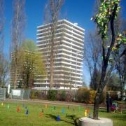 Technisch unterstützt von Herrn Betzle, Ingenieur der neuen Landesgartenschaubrücke, konnte die Eiche in einem Betonsockel von einer Tonne Gewicht sicher von drei erfahrenen Männern aufgestellt werden. Wenn die Blüten und Blätter im Wind rauschen ist das für die Schüler und hoffentlich auch für die Besucher eine besondere Erfahrung. Die Schulkunstaustellung ist über das mittlere der fünf Hochhäuser in der Römerstraße kostenlos zugänglich.