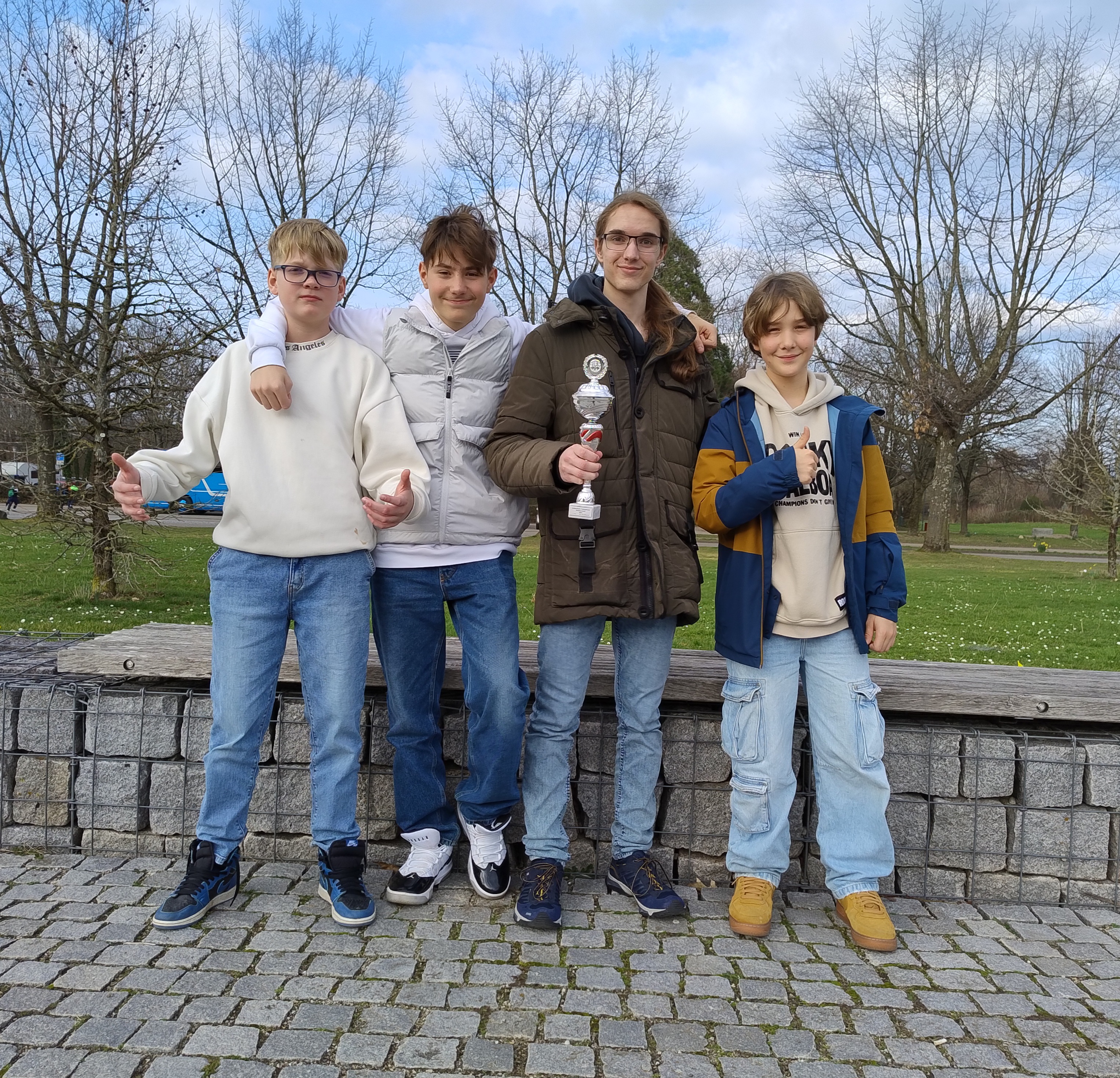 David Obert (R9b, 5 (!) Punkte), Alen Miroc (R8b, 3,5 Punkte), Eliah Meier (R8b, 3 Punkte) und Pino Hog (R7a, 3,5 Punkte) waren für die insgesamt starke Gegnerschaft in fünf Runden nicht zu besiegen, sodass am Ende eines langen Schach-Tages der Sieg in der Wertungsklasse der Realschulen erreicht werden konnte. Der Titel des südbadischen Meisters geht damit in diesem Jahr hochverdient nach Ettenheim.