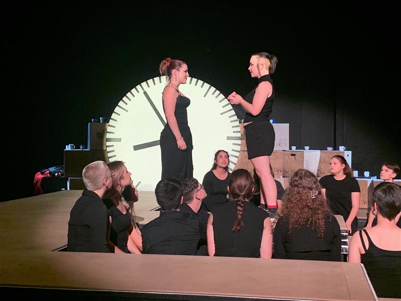 Am Donnerstagvormittag widmeten wir uns erneut der Arbeit in unseren Laboren, während die Aufregung auf unsere eigene Aufführung am Abend stieg. Nach der Mittagspause ging es dann direkt ans Proben im Stadttheater, um ein Gefühl für die ungewohnte Bühne zu bekommen. Die Zeit verging wie im Fluge und ehe wir uns versahen, füllte sich der Zuschauerraum und die Aufführung begann. Das Stück war ein ein voller Erfolg, was an zahlreichen positiven Rückmeldungen deutlich wurde. Gemeinsam mit den anderen Teilnehmern der Schultheatertage ließen wir den Abend mit einem kleinen Wettbewerb am Haus der Jugend ausklingen.