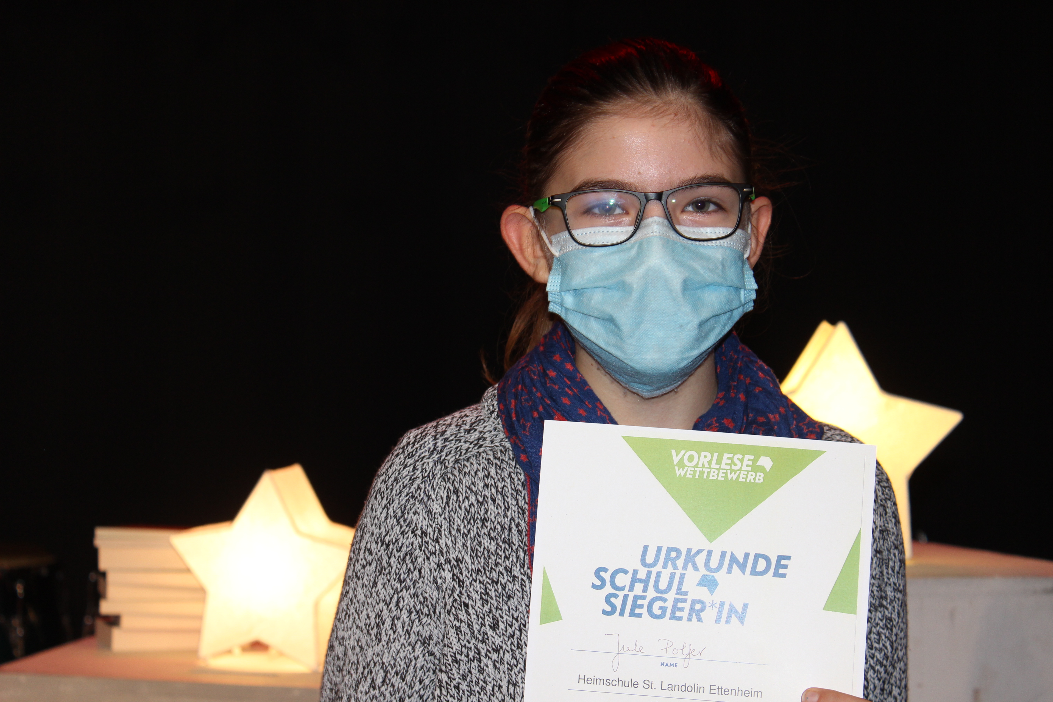 Die überzeugendste Gesamtleistung zeigte in diesem Jahr Jule Polfer aus der G6a, die zu unserer diesjährigen Schulsiegerin gekürt wurde und sich wie die anderen Teilnehmer auch über Buchgeschenke freuen durfte.