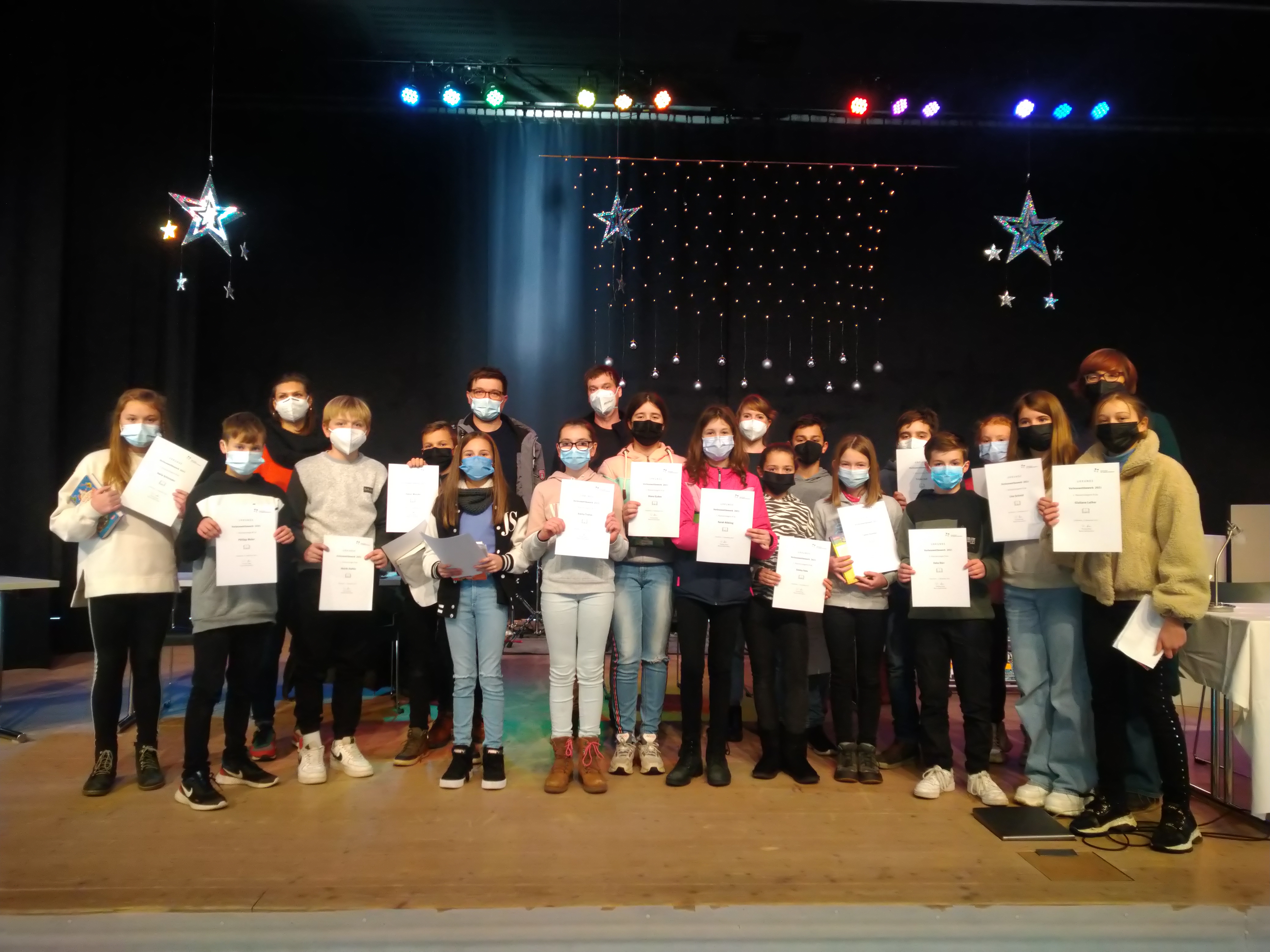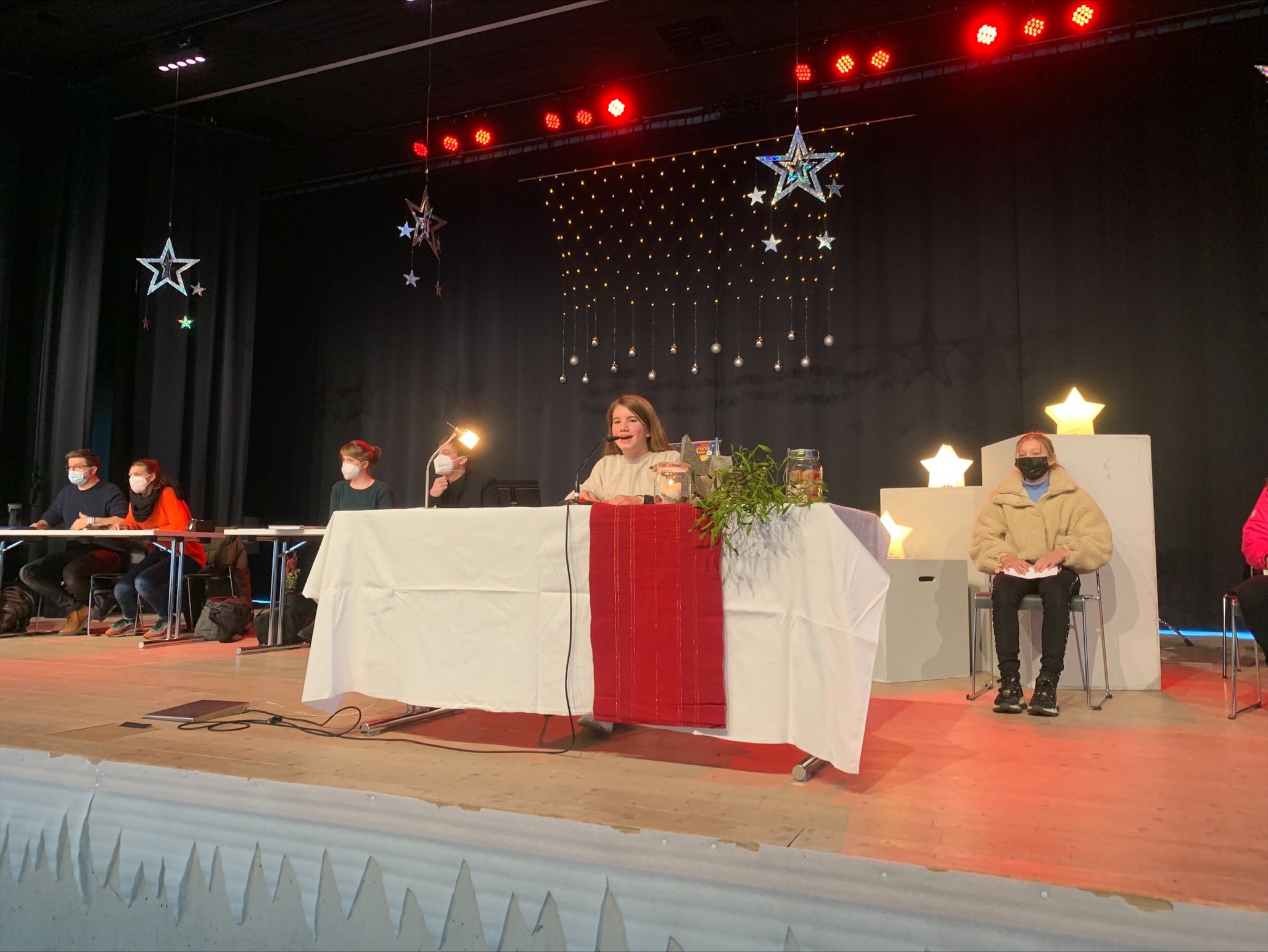 Zunächst wurden während der letzten Wochen innerhalb der einzelnen Klasse kleine eigene Wettbewerbe durchgeführt, sodass jede Klasse zwei Teilnehmer ins Rennen um den Schulsiegertitel schicken konnte. Am Freitag, den 3. Dezemebr 2021 war es dann wieder soweit und in der weihnachtlich geschmückten und stimmungsvoll beleuchteten Aula konnte der Vorlesewettbewerb starten.