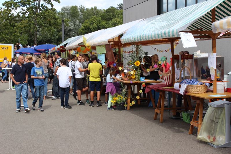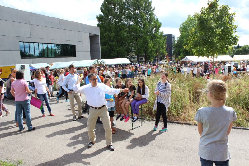 Bei angenehmen Temperaturen feierte die gesamte Heimschulgemeinschaft ihr traditionelles Sommerfest kurz vor Beginn der Sommerferien. Unter der Leitung des Gesamtelternbeirates der Heimschule St. Landolin hatten sich vor allem die Klassen der Unterstufe mächtig ins Zeug gelegt. An den unterschiedlichsten Getränke- und Essenständen wurden die zahlreichen Besucher sehr verwöhnt. Ob man eine Vorliebe für Steaks, Bratwürste, Burger, Flammkuchen, Waffeln, Kuchen, Smoothies, Salate, Muffins, Cocktails oder anderen antialkoholischen Getränken hat, jeder kam auf seine Kosten. Zwischendurch konnten sich Eltern, Lehrer und Schüler auf dem Geschicklichkeitsparcours mit Dosenwerfen, Ballschleuder, Torwandschießen uvm. beweisen oder sich bei der „Großen Heimschulrallye“ den Fragen rund um die Schule stellen. Schöne Preise gab es zu gewinnen. Eberhard Pfister, der dieses Sommerfest zum ersten Mal als Schulleiter erlebte, konnte seine Fähigkeiten besonders an der „Schaumküssewurfmaschine“ unter Beweis stellen, denn ihm gelangen bei drei Würfen auf das Wurfziel zwei Volltreffer.