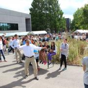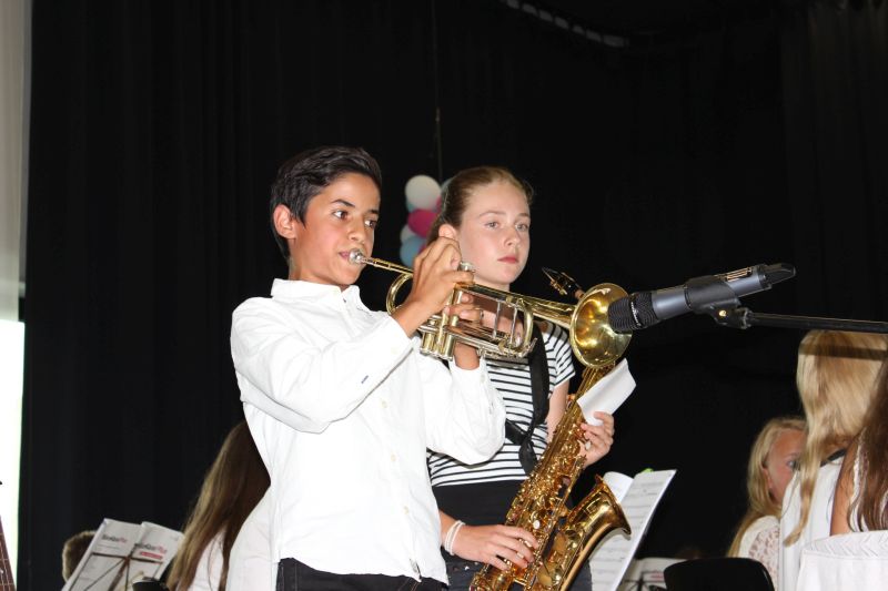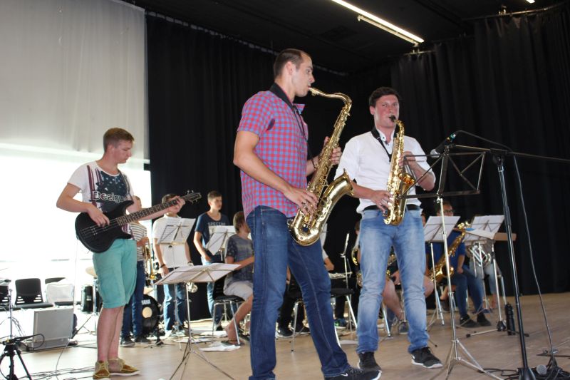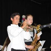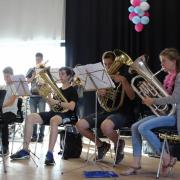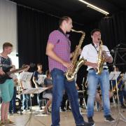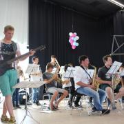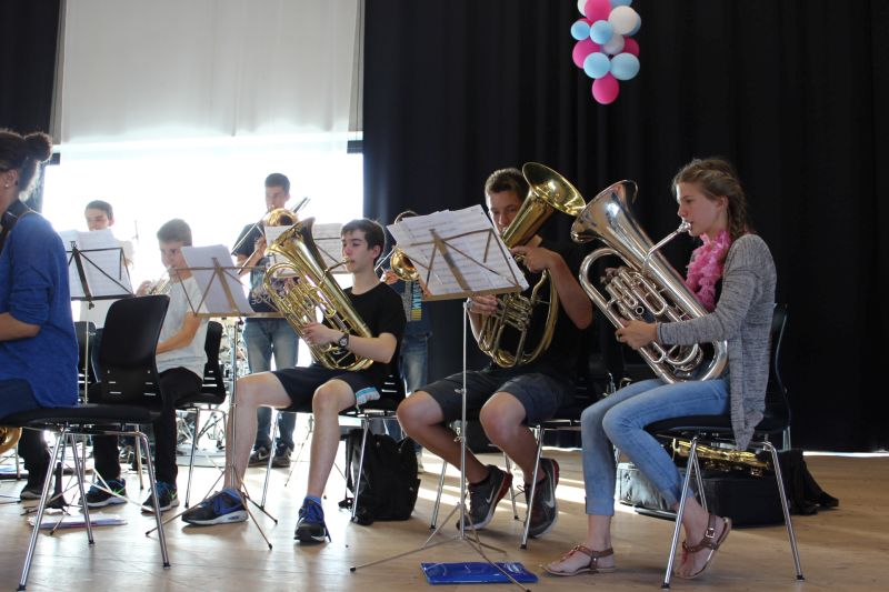 Während anregende Gespräche auf dem Außengelände geführt wurden, versammelte man sich in der Aula, um die Orchester-Klasse 7 der Realschule unter der Leitung von Tobias Schulz und die „Jazz Chillers“ unter der Leitung von Markus Albu zu hören. Besonders beeindruckend und immer wieder applaudiert wurden die Soli der einzelnen Bläser in den beiden Bands. Angel Saumer, Hannah Kollmer, Marius Ambs, alle drei aus der R 7, sowie Cedrik Lin (G 10b), Simon Mayer, Ruben Kilchling und Marius Hägle aus der Oberstufe traten schon sehr abgeklärt und professionell vor das große Publikum.