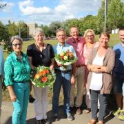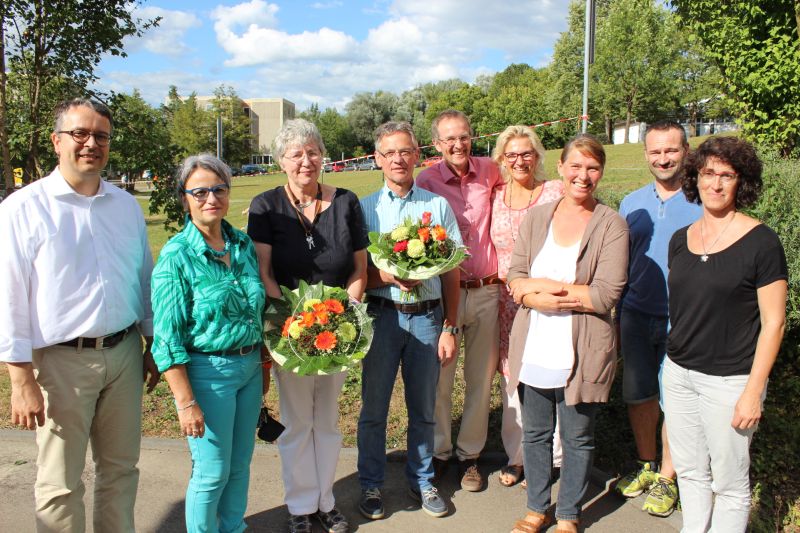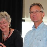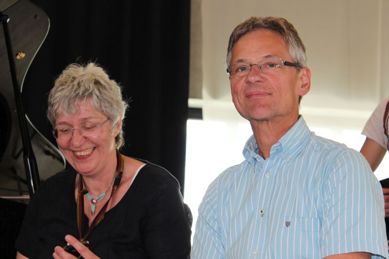 Ein besonderer Höhepunkt war die Ehrung von zwei langjährigen Elternbeiräten. Renate Darrmann, ebenfalls im Vorstand des Gesamtelternbeirates, brachte den „HESL-Chor“ auf die Bühne der Aula. „HESL“ stehe für Hausmeister, Eltern, Schulleitung, Lehrer. Mitgebracht hatte dieser spontan zusammengesetzte Chor ein Loblied auf die beiden Elternbeiräte Eugenia Singler und Johann Oberle, die 17 bzw. 19 Jahre als Elternbeiräte fungiert haben und jetzt zum neuen Schuljahr 2015/16 ausscheiden werden. Gesamtschulleiter Eberhard Pfister und Realschulrektorin Ulrike Hugel bedankten sich bei Eugenia Singler, die auch viele Jahre das Amt des Gesamtelternbeirates der Heimschule, sowie das Amt des Gesamtelternbeirates in der Schulstiftung Freiburg innehatte, und bei Johann Oberle für die sehr konstruktive Zusammenarbeit über diese lange Zeit. Das Sommerfest sei ein öffentliches Zeichen dieser Zusammenarbeit, aber dazu gehören auch die vielen wegweisenden Gespräche um das Wohl der Heimschule, äußerte Oberstudiendirektor Pfister. Als Zeichen der Wertschätzung erhielten Eugenia Singler und Johann Oberle kleine Präsente aus den Händen der Schulleitungen. Bei beiden Geehrten geht jetzt auch eine lange Zeit zu Ende, in der ihre Kinder, insgesamt sechs, auf der Heimschule St.Landolin ihre Schulabschlüsse gemacht haben.