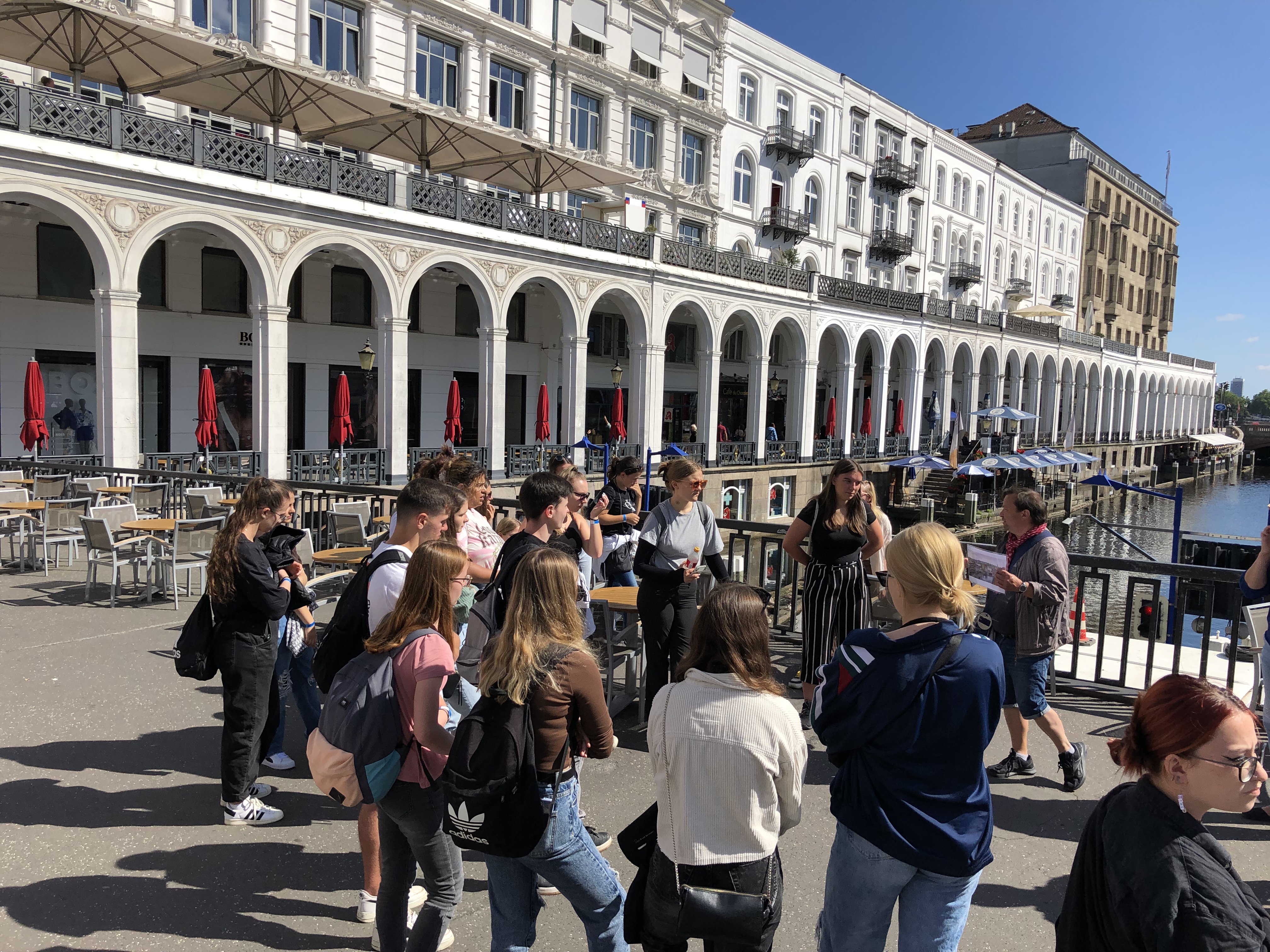 So ließ die S13b den Montagabend nach der Anreise entspannt angehen – gemeinsam mit der S13a und dem WG besuchten wir die bekannten Landungsbrücken und den wunderschönen Elbstrand. Bei einem kühlen Getränk wurden erste Eindrücke und Impressionen ausgetauscht, bevor die Klasse zurück ins a&o Hostel, welches sehr bahnhofsnah gelegen ist, fuhr. Neben einer Stadtführung und einer Hafenrundfahrt bekam die Klasse weitere tiefe Einblicke in das Leben Hamburgs. Ein Besuch beim Straßenmagazin Hinz& Kunzt ermöglichte einen Einblick in das Leben auf der Straße und den harten Kampf, diesem zu entkommen. Passend zum Schulzweig erklärte die dort verantwortliche Sozialarbeiterin, wie wichtig diese Arbeit sei und dass das Engagement Hilfe zu leisten der erste Schritt zur Bekämpfung von Obdachlosigkeit und Armut wäre. Aber auch der Weitblick dafür, Strukturen im System zu erkennen, wurde geschärft. Jede einzelne Schülerfrage wurde beantwortet und jeder konnte viel von diesem Tag mitnehmen.