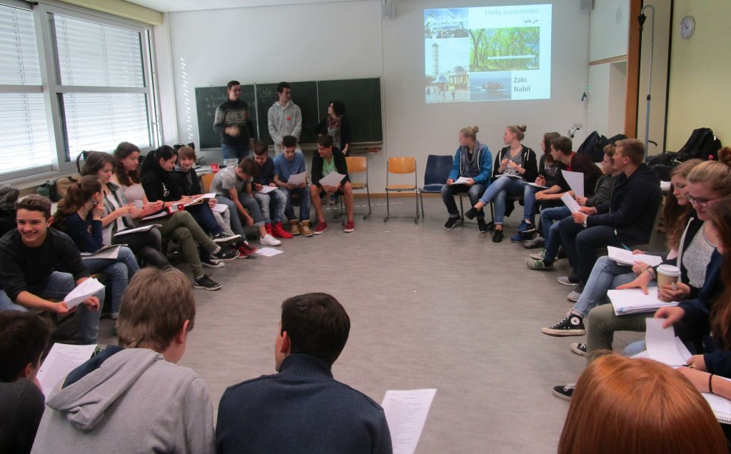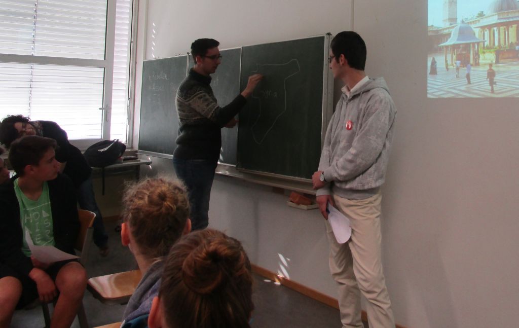 Am 12. April 2016 waren die zwei syrische Brüder Nabil (19 Jahre) und Zaki (27 Jahre) bei der Klasse G 9b der Heimschule St. Landolin zu Besuch und erzählten die Geschichte ihrer Flucht. Sie sprachen u. a. über die Missstände in Syrien und über ihr Leben in Deutschland. Das alles erklärten sie anhand einer interessanten Präsentation und in einigen Tafelbildern, die ausführlich das Thema Syrien betrachteten.