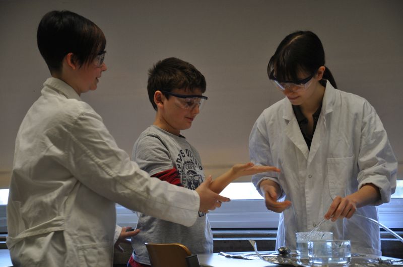 Besonders aufregend waren natürlich die Experimente der naturwissenschaftlichen Fächer. Der aktuelle Chemie-Neigungskurs weihte die staunenden Besucherinnen und Besucher in die Geheimnisse der Chemie ein: Die Mutigsten konnten sich sogar – vollkommen gefahrlos – die eigene Hand anzünden lassen.