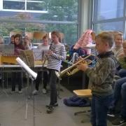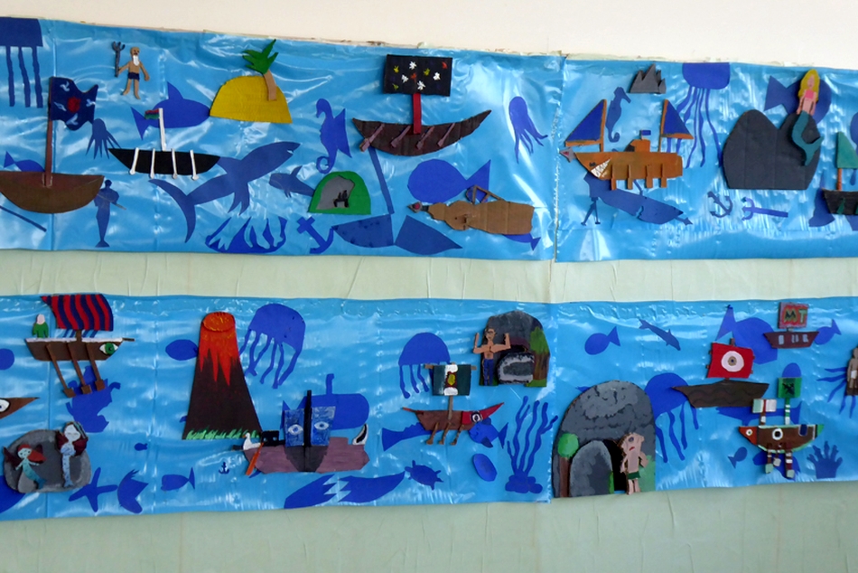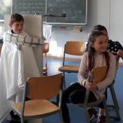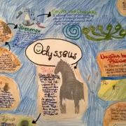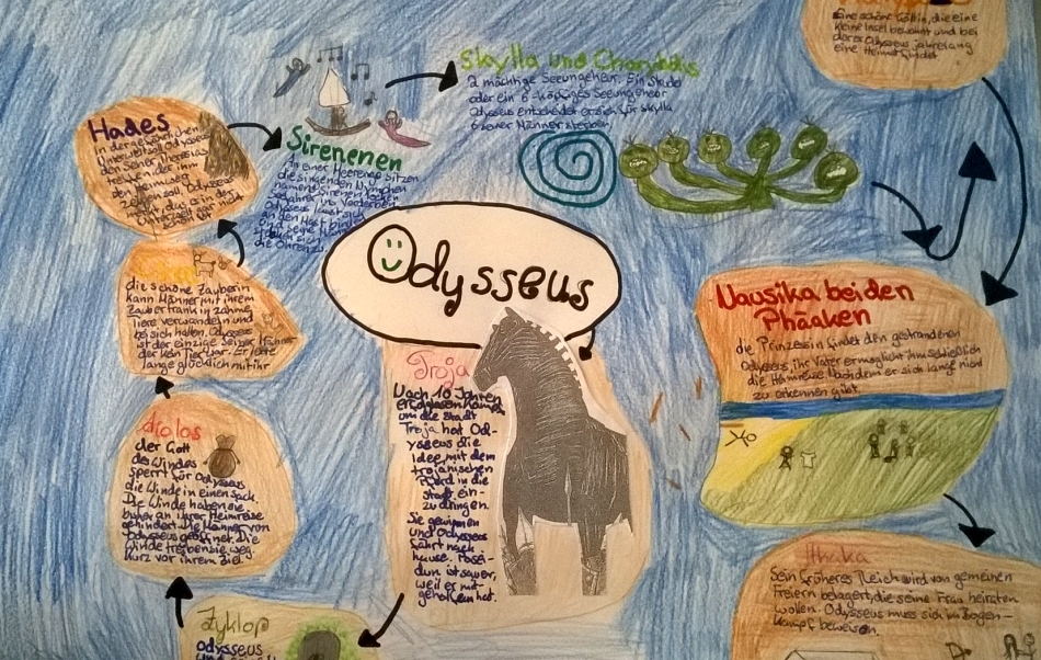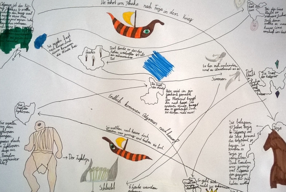 Während die Schüler in Geschichte die historische Quellenlage mit kritischem Blick prüfen und beim Verfassen eines Zeitungsartikels erste Erfahrungen mit journalistischem Arbeiten machen, wird im Fach Deutsch bei der szenischen Umsetzung einzelner Episoden der Odyssee Identifikation mit den einzelnen Personen möglich. Interviews, Flaschenpost und Briefe sind die Ergebnisse produktiver Schreibaufgaben. Die selbstständige Erarbeitung einer Gedankenlandkarte zum Thema steht im Bereich Wort und Bild auf dem Programm. Schülerinnen und Schüler lernen verschiedene Möglichkeiten der Visualisierung am Beispiel von Comicbildern, Hörspielen oder Zeichentrickfilmen kennen. Ebenso kreativ setzen sie sich im Fach Bildende Kunst oder in Musik mit markanten Episoden aus der Odyssee auseinander. Mit Hilfe von mitgebrachten Requisiten, Mimik und körperlicher Ausdrucksfähigkeit werden mit sichtlich viel Spaß und tollen Ideen zum Beispiel eine rudernde Schiffsmannschaft, der Kampf mit dem Zyklopen oder der Bogenkampf dargestellt. Mit Orffschen Instrumenten werden Szenen musikalisch illustriert und die jeweilige Stimmung verstärkt, aber auch Gefühle wiedergegeben. So wird die dumpf-schaurige Atmosphäre des Schattenreichs oder die Bedrohung durch die verführerisch lockenden Sirenen eindrucksvoll gestaltet. Bei der Präsentation vor gespanntem Publikum treten schließlich auch musikalisch geübtere Schülerinnen und Schüler als „Seefahrer-Orchester“ auf, wodurch die Vorführung für Darsteller und Zuschauer zu einem eindrucksvollen Erlebnis wird.