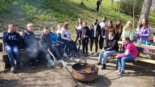 Danach durften wir noch unser eigenes Feuer entfachen. Nachdem wir das Gemüse geschnippelt und einige das Brot für die Burger vorbereitet hatten, durften wir eine Runde spielen. Mit riesigem Hunger durften wir nun das Brot entweder mit Frischkäse oder Marmelade bestreichen. Zum großen Finale durften wir am Lagerfeuer in runden Siebkörben Popcorn zubereiten. Nachdem wir uns von unseren Rangerinnen verabschiedet hatten, endete dieser erlebnisreiche Tag und es ging wieder nach Hause.