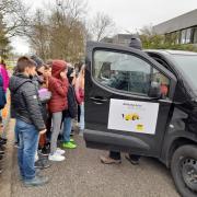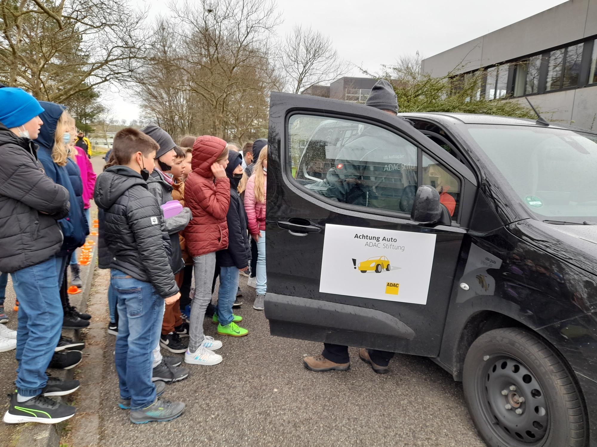 Das Bild zeigt die Schüler der R5c, die als Mitfahrer zum Abschluss der Einheit „Achtung Auto“ eine Vollbremsung bei 30 km/h, natürlich gesichert, im Aktionsfahrzeug erleben durften.