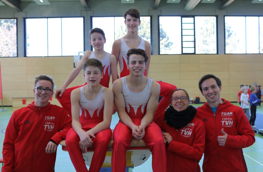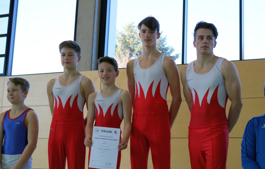 Auch die Jungen-Mannschaft musste im RP-Finale einen verletzungsbedingten Ausfall verkraften: Obwohl Rick Brillaut nicht turnen konnte,lieferten Mika Stelter, Paul Herrmann David Schweizer und Ruben Hanke einen hervorragenden Wettkampf und gewannen souverän mit 12 Punkten Vorsprung vor der zweitplatzierten Mannschaft. Ob diese Leistung für eine Fahrkarte nach Berlin ausreicht, wird sich dann beim Landesentscheid zeigen. Auf jeden Fall schon einmal bis zu dieser Ebene eine tolle Leistung, über die sich auch das Betreuerteam David Lang, Tibor Mellert und Birgit Walz sehr freuen.