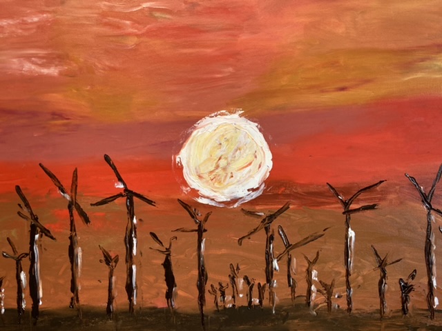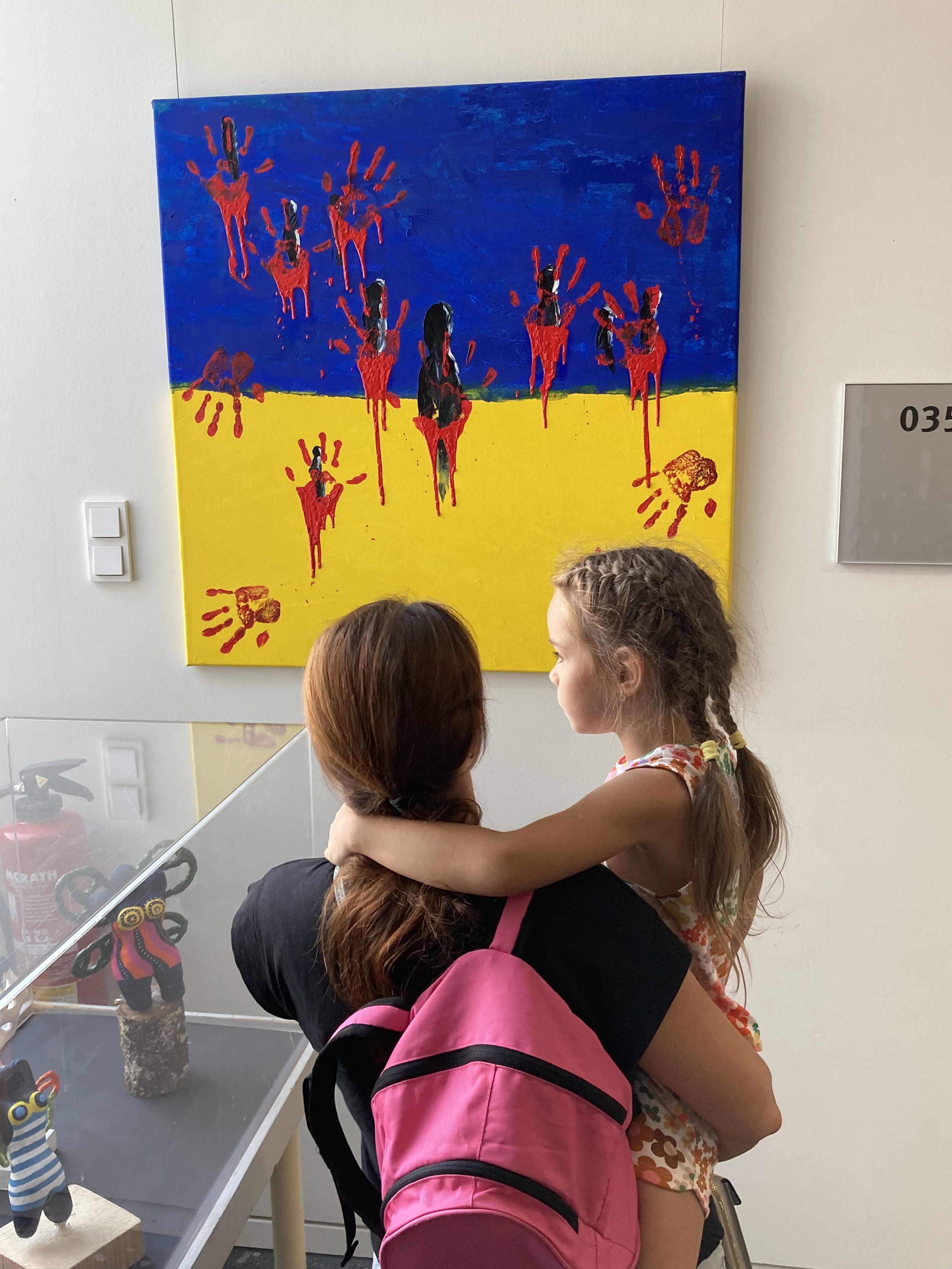 Bei einer kleinen Vernissage hatten sich die ukrainischen Familien, die auf dem Heimschulcampus leben, und interessierte Schülerinnen und Schüler eingefunden. In Anwesenheit von Dascha Bezkosta beantwortete ihre Mutter Fragen zu den Bildern. Als Übersetzerin gab Kunstlehrerin Dana Wurth wichtige Eindrücke wieder: So seien in den Bilder natürlich Kriegserlebnisse verarbeitet, aber auch der neuen Gemeinschaft der drei Familien, die nun in Ettenheim zusammenleben, sei ein Bild gewidmet. Am Schwarzwald seien die Windräder für die junge Künstlerin ein neuer Eindruck, weshalb auch sie ihren Weg in eines der Bilder gefunden haben.