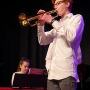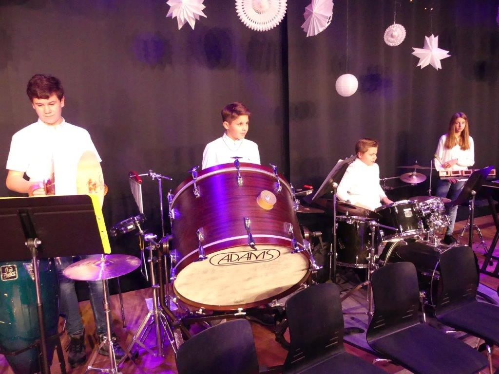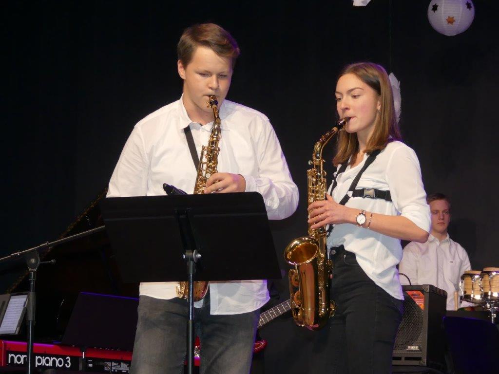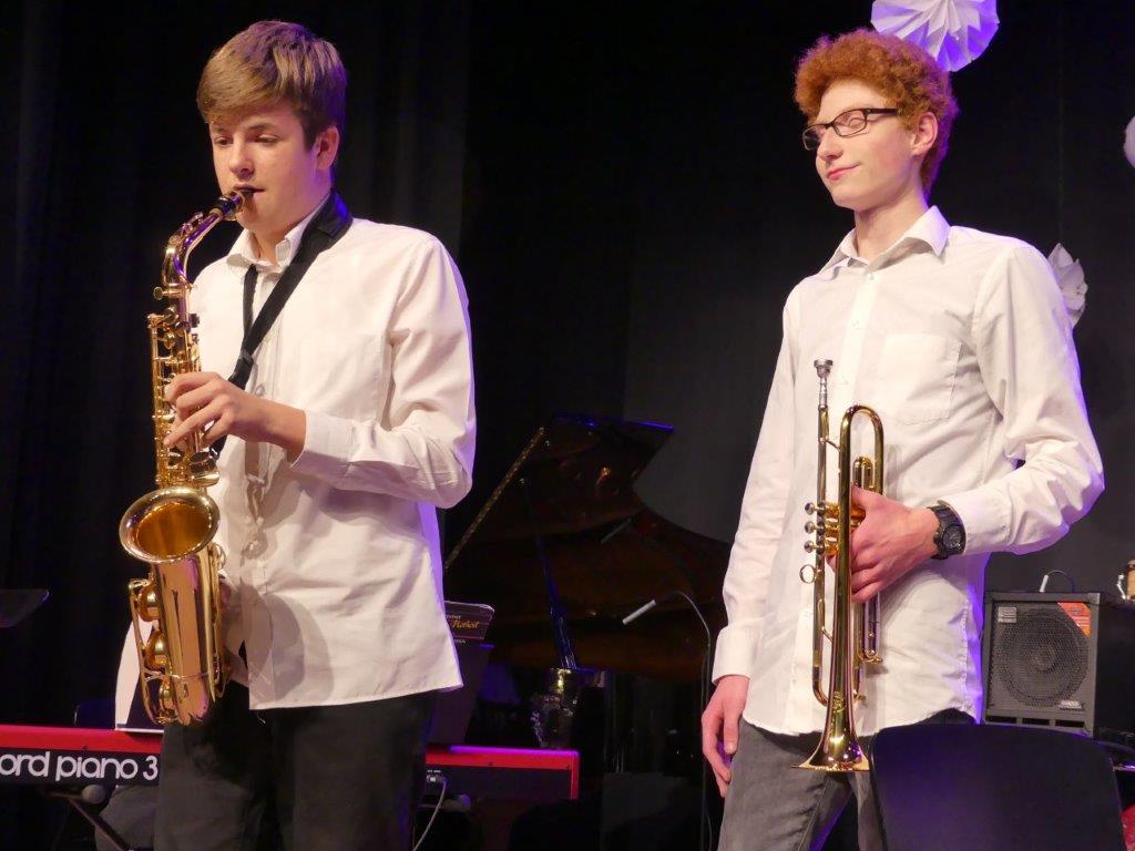 Zum Abschluss des Konzertabends spielten die erfahrenen und bestens geschulten Musiker der Abschlussklassen R 10. Dem Musiklehrer Tobias Schulz, selbst Schlagzeuger in mehreren Ensembles, liegen Stücke mit amerikanischen Rhythmen, bei denen die Gäste sogleich auch mitschnipsten oder mitklatschten. Im „River City Blues“ ließ sich das, einem Ehestreit ähnlichen Duett der Saxophonsolisten Max Trotter und Greta Leser heraushören. Das letzte Musikstück des sehr gelungenen Konzertabends hieß „Go Charlie go“ und wurde von dem „Kuhglocken“-Schlagwerk von Musiklehrer Schulz geprägt.