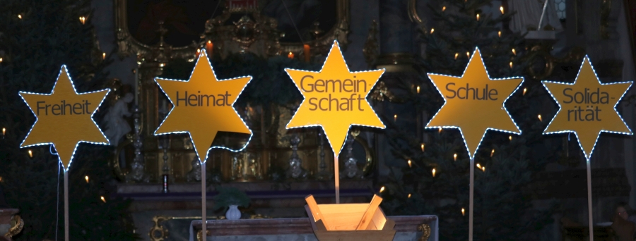 Fünf große Sterne mit den Begriffen Freiheit, Heimat, Gemeinschaft, Schule und Solidarität standen im Zentrum der Weihnachtsgottesdienste für die Klassen 5 bis 10, die am letzten Schultag vor Weihnachten in der Ettenheimer Stadtkirche gefeiert wurden. Diese Worte können wahre Sternstunden ausdrücken, wenn sie mit positiven Erlebnissen in Verbindung gebracht werden. So kann ein Klassenerlebnis Gemeinschaft erfahrbar oder etwa das Besteigen eines hohen Berges die Ahnung von Freiheit spürbar machen.