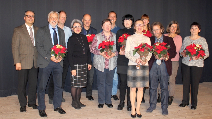 Bereits am Mittwochabend hatten sich alle Mitarbeiterinnen und Mitarbeiter zur Weihnachtsfeier zusammengefunden. In der weihnachtlich geschmückten Aula stimmte der Lehrerchor unter der Leitung von Andrea Frey-Melder und Markus Albu auf die Festtage ein und das Küchenteam um Reinhard Mussler verwöhnte das Kollegium mit einem weihnachtlichen Menü. Gesamtleiter Eberhard Pfister benannte die Weihnachtstage als Anlass zum Innehalten und sich auf das Wesentliche zu besinnen. So sei es für die Heimschule St. Landolin wesentlich, dass immer wieder neu gemeinsam über die Frage nachgedacht wird, was uns in unserem Schulalltag leitet und antreibt. Zentral sei hier sicherlich ein Sinn für Gemeinschaft, der sich auch in der gemeinsamen Weihnachtsfeier ausdrücke. Realschulrektorin Ulrike Hugel fügte hinzu, dass dies auch in den zahlreichen Ehrungen für langjährige Tätigkeiten an unserer Schule zum Ausdruck komme, die traditionell ihren Platz bei der Weihnachtsfeier finden. Neun Mitarbeiterinnen und Mitarbeiter wurden von der Schulleitung und der Mitarbeitervertretung mit persönlichen Dankreden und Präsenten bedacht.
