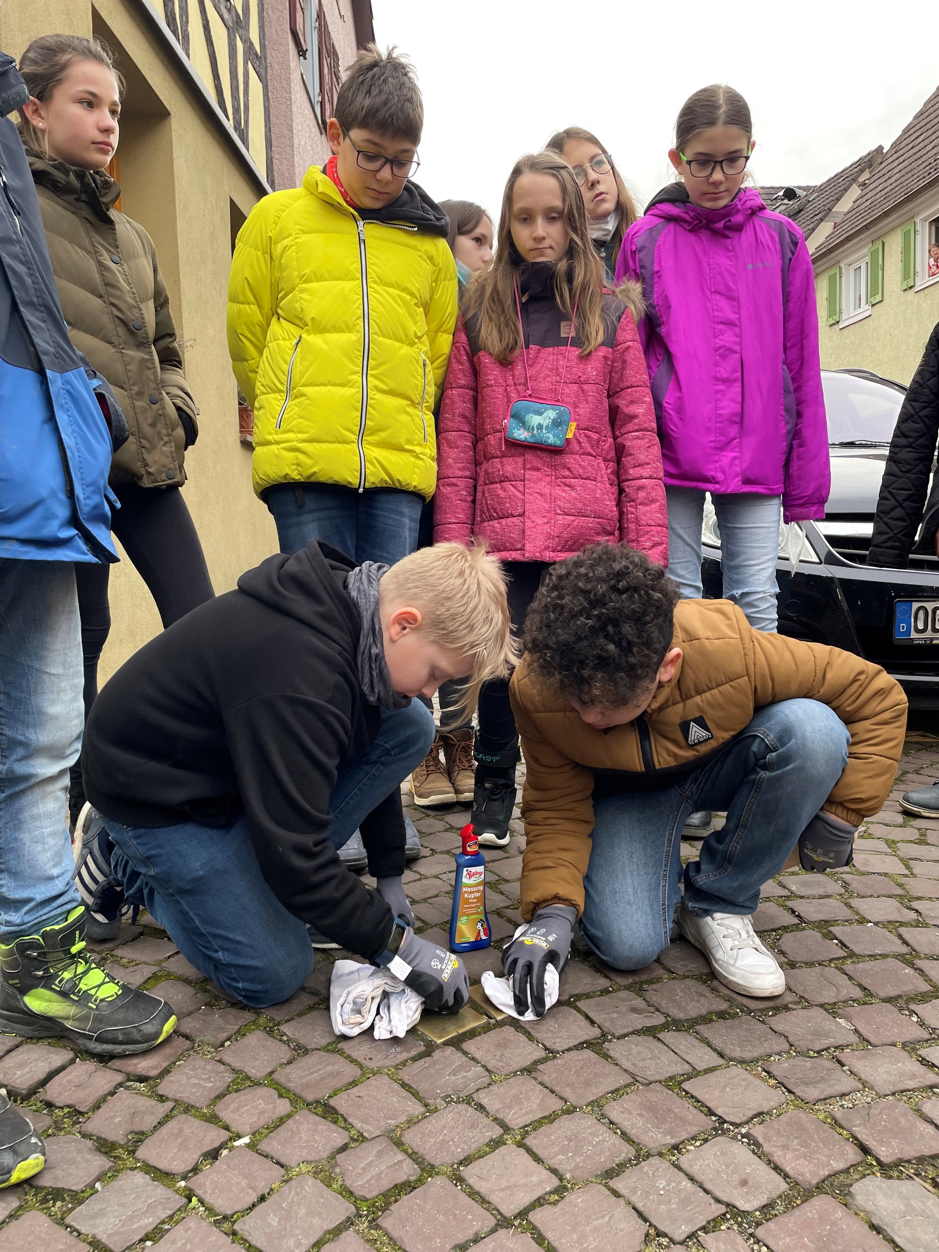 Diesen „Zahlen“ wollten wir ein Gesicht und damit wieder ihre Identität zurückgeben: Wir behandelten, wie die Reichspogromnacht 1938 in Ettenheim verlief und informierten uns über die Deportation von Ettenheimer Juden nach Gurs 1942. Wir blieben aber nicht bei den Zahlen, sondern entschlossen uns, das Klassenzimmer zu verlassen und Spuren in Ettenheim zu suchen. Wir stießen auf die Stolpersteine, auf denen die Namen, Geburts-, Deportations- und Todesdatum stehen. Symbolisch verliehen wir ihnen wieder ein Gesicht, indem wir sie polierten, sie also neu sichtbar machten.