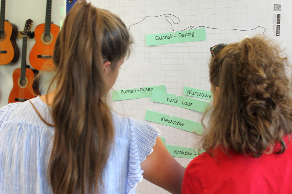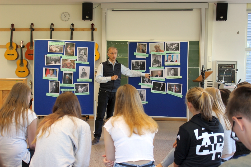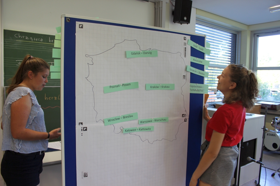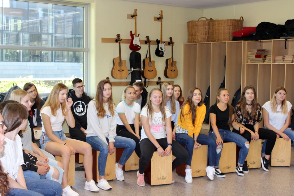 Am Auftakt der Woche daher auch möglichst viel gemeinsame Aktivität der jeweils 15 polnischen und deutschen Schülerinnen und Schüler, um schnell ins Gespräch zu kommen – auf Deutsch, Polnisch, Englisch oder mit Händen und Füßen: Im Mittelpunkt des Vormittages, in der alle den Unterricht besuchten, stand eine gemeinsame Stunde, die Musiklehrer Werner Wittstock und Geschichtslehrer Martin Kollefrath leiteten.