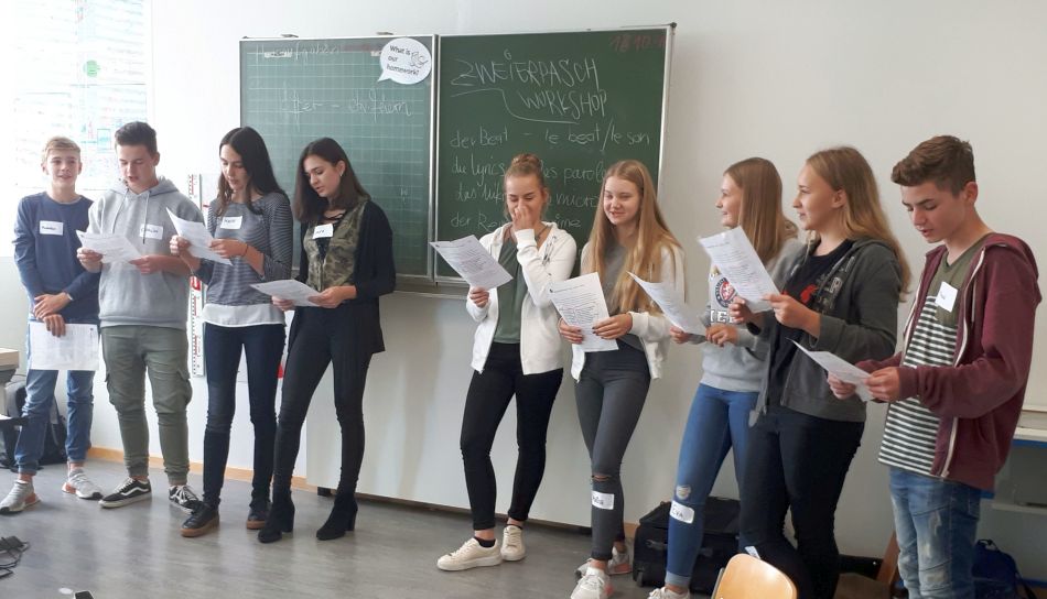 Bei den Workshops ging es darum, Rap-Rhythmen zu einem deutsch-französischen Songtext einzuüben und schließlich in einem Rap-Wettstreit möglichst überzeugend zu performen. Der Song „typique, typique – typisch, typisch“ setzt sich augenzwinkernd mit Klischees vom „Deutsch-“ bzw. „Französischsein“ auseinander. Die Workshops stießen auf großen Anklang mit beat und paroles im gereimten Gesang. Der stellvertretende Schulleiter des Gymnasiums und Französischlehrer Wolfgang Mutter erklärt: „Zum einen passen die Inhalte wunderbar in die Lehrpläne, die neben dem Bekanntmachen der Kultur des Nachbarn auch den Anstoß von Freundschaften über Austauschprogramme beinhalten. Zudem bedeutet der Einstieg in die französische Sprache und deren Vertiefung über Hip-Hop für die Schülerinnen und Schüler natürlich zusätzlich Motivation. Damit sind sie pädagogisch besonders wertvoll.“
