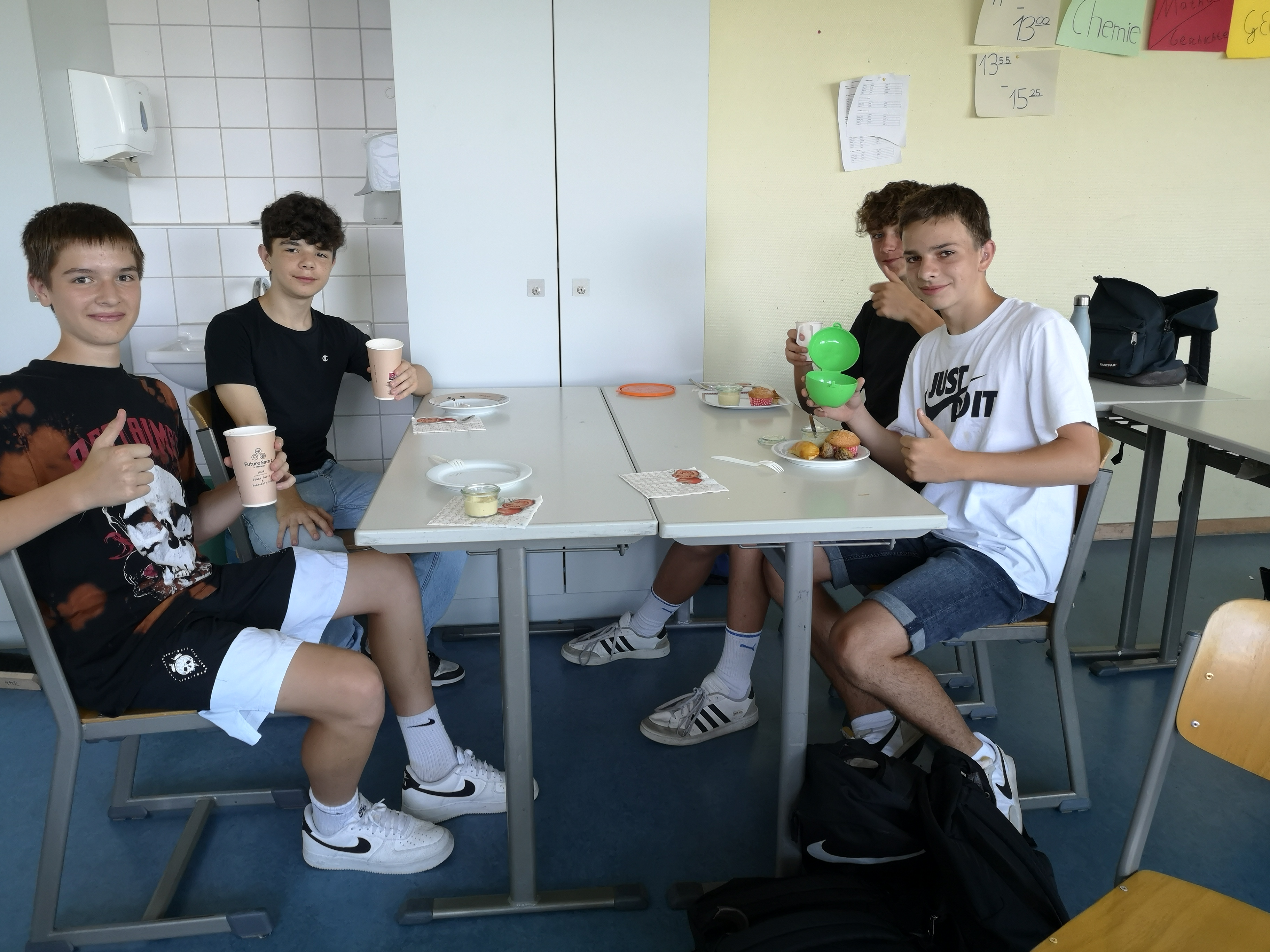 „Guten Appetit“ wünschten sich die Spanisch-Schülerinnen und -schüler der G08be, die für die letzten beiden Spanischstunden in diesem Schuljahr ein reichhaltiges Tapas-Buffet vorbereitet hatten. ¡Qué rico! Wie lecker und reichhaltig – da fehlte es an nichts! Albóndigas, croquetas, pan con tomate, aceitunas, empanadas, um nur ein paar Wenige zu nennen. Und eine alkoholfreie Sangría durfte natürlich auch nicht fehlen. Im Vorfeld erfuhren die Schülerinnen und Schüler im Unterricht einiges über Tapas, die Esskultur in den verschiedenen spanischen Regionen, den Einfluss des Klimas und warum die Essenszeiten im Vergleich zu Deutschland so unterschiedlich sind.