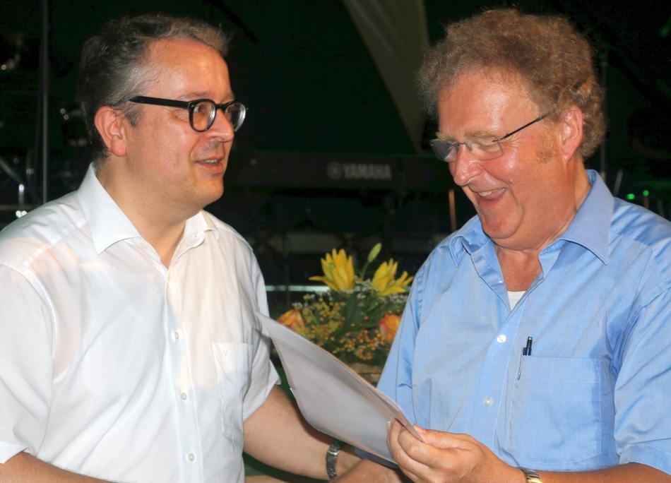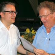 Auch aus dem Kreis der Religionsfachschaft wurde Ernst Hoffmann-Rau verabschiedet. 25 Jahre unterrichtete er evangelische Religion und stand dabei nicht nur für die ökumenische Verbundenheit an einer katholischen Schule, sondern mit seinem Einsatz an allen Schularten für das die Vielfalt der Heimschule. Matthias Küchle bezeichnete ihn angesichts der Offenheit und Neugier, die Ernst Hoffmann-Rau charakterisieren, als „Weltbürger“, von dem seine Schülerinnen und Schüler sehr profitieren konnten. Eberhard Pfister unterstrich dies: Auch dank seines trockenen Humors sei Ernst Hoffmann-Rau bei Schülern und Kollegen außerordentlich beliebt. Umso dankbarer zeigte sich die Schulleitung, dass er im kommenden Schuljahr aus dem Ruhestand heraus bereitsteht, um bei Engpässen als Lehrkraft auszuhelfen.