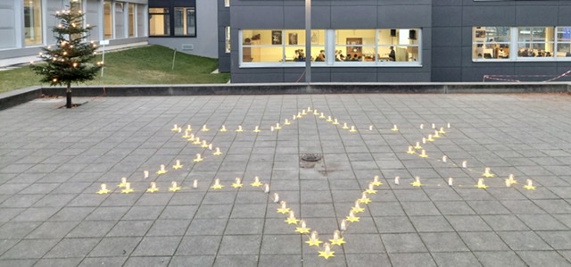 Zu Beginn der ersten Schulstunde wurde in jedes Klassenzimmer ein kurzer Impuls übertragen, den Schulseelsorgerin Sonja Rupp und die Fachschaft Religion gemeinsam vorbereitet hatten. Auf dem Weg, auf dem normalerweise organisatorische Durchsagen gemacht werden, erreichte alle Schülerinnen und Schüler die Zusage des Weihnachtsfestes: Gott kommt in die Welt – er bringt Licht in unser Dunkel. Symbolisch wurde in jeder Klasse eine Kerze entzündet, die dann zu einem großen Stern auf dem Schulhof zusammengetragen wurden. Ein Bild der Hoffnung und Verbundenheit.
