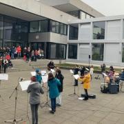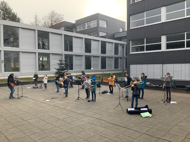In der fünften Stunde verabschiedeten sich die Schülerinnen und Schüler gemeinsam von ihren Klassenlehrerinnen bzw. -lehrern voneinander in die Weihnachtsferien. Der Weg aus dem Schulgebäude wurde von Tau-Band unter der Leitung von Daniel Gaschick musikalisch begleitet: Viele verließen so singend, schwingend und mit einem Lächeln auf dem Gesicht die Schule.