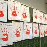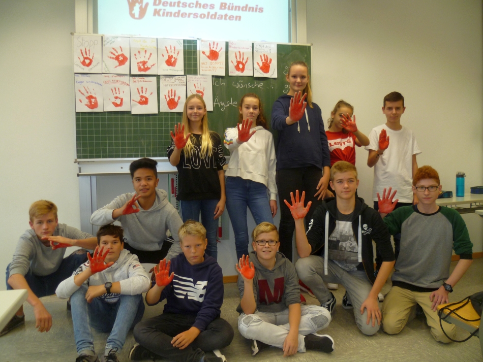 26 rote Hände mit viel Bedeutung: Während der Thementage der Realschule setzten die Schülerinnen und Schüler der 8. Klasse ein Zeichen gegen den Missbrauch von Kindern als Soldaten. Sie unterstützen damit die „Aktion Rote Hand“.