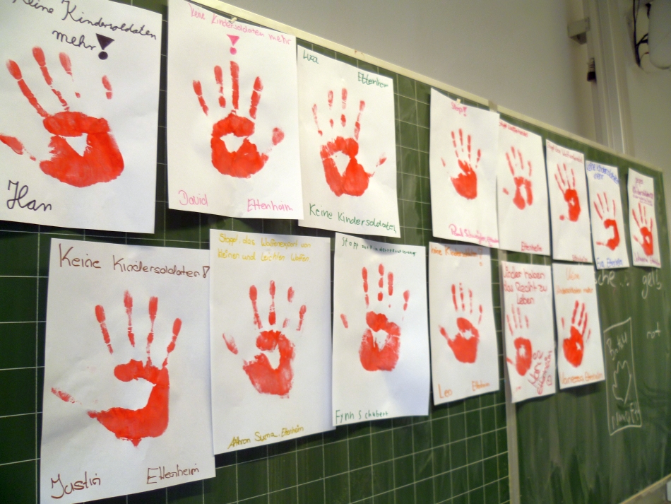 Seit über zehn Jahren gibt es die Aktion und den „Red Hand Day“ am 12. Februar, den internationalen Gedenktag an das Schicksal von Kindersoldaten. Im Vorfeld gilt es, so viele rote Handabdrücke wie möglich zu sammeln. Hunderttausende rote Handabdrücke wurden schon in über 50 Ländern gesammelt und an Politiker und Verantwortliche übergeben, darunter der UN-Generalsekretär Ban Ki Moon, der deutsche Außenminister und der Bundespräsident. Doch trotz vieler Erfolge gibt es leider immer noch 250.000 Kindersoldaten weltweit.