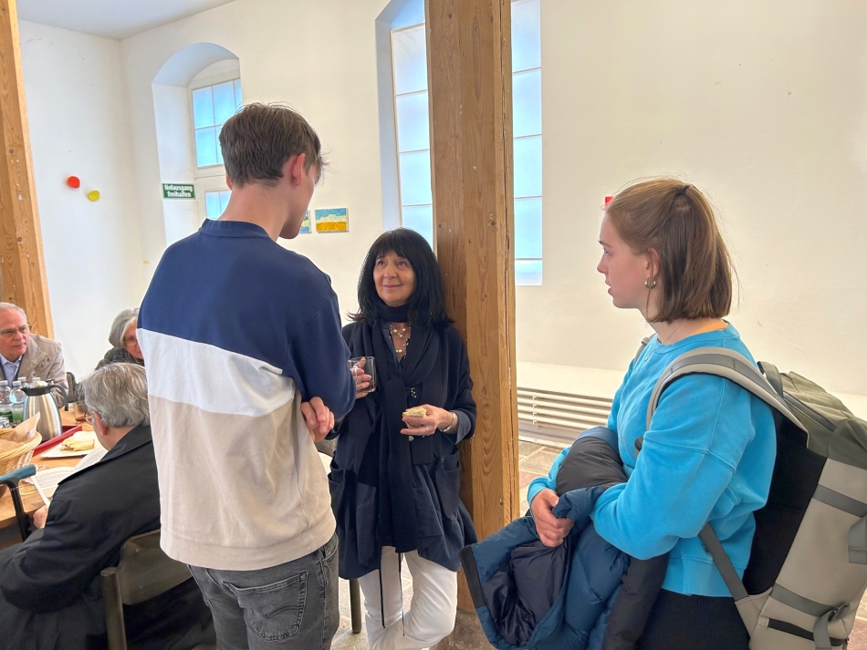 Im anschließenden Gespräch in den neuen Räumen der ehemaligen Altdorfer Synagoge, die heute als Kunsthalle hergerichtet ist, durften die Schülerinnen und Schüler der Klasse R7e von Herrn Giesel Fragen an die anwesenden Familienmitglieder stellen. Sie erfuhren, wie es für sie war, zum ersten Mal in Deutschland einzureisen oder wie sehr sie das Schicksal ihrer Verwandten ein Leben lang beschäftigte.