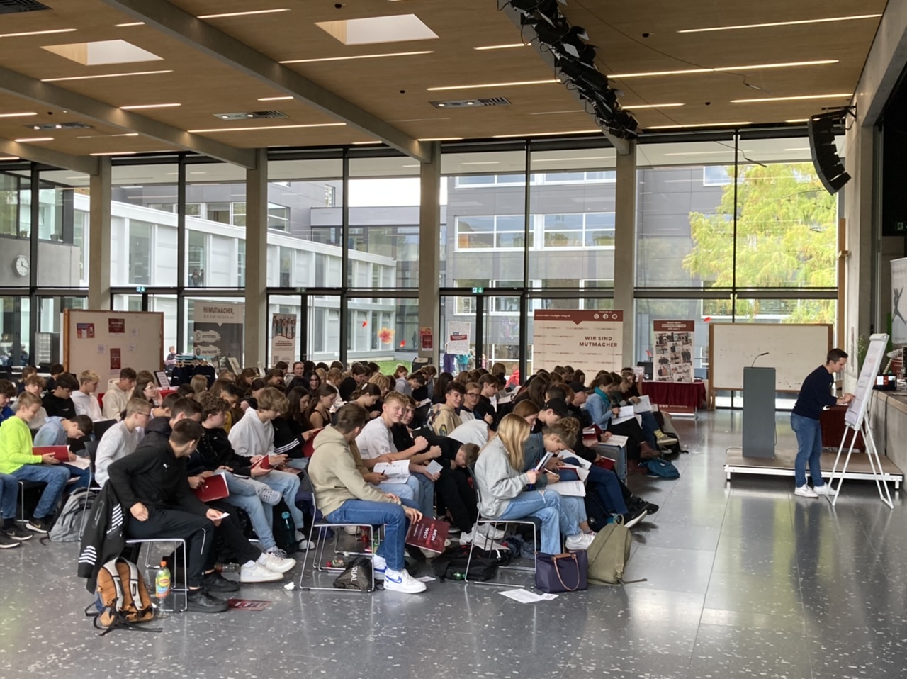 „Baue Selbstvertrauen auf! Das ist für mich der zentrale Punkt des Tages“, erklärt Pascal Keller den Teilnehmerinnen und Teilnehmern des Workshops und lädt sie damit dazu ein, sich über eigene Stärken Gedanken zu machen. Hier wird deutlich: Beim Angebot der „Mutmacher“ geht es in Sachen Berufsorientierung nicht ausschließlich darum, sich über die Möglichkeiten von Ausbildungen und Studiengängen zu informieren. Vielmehr steht im Mittelpunkt, sich zu überlegen, wie man zu eigenen – mutigen Entscheidungen – kommt. An der Heimschule konnten hierfür alle 9. und 10. Klassen des Gymnasiums je einen ganzen Vormittag erleben, an denen sie Vorträge hörten, in Partnerübungen oder für sich allein darüber nachdachten: Welche Ziele habe ich? Was sind meine Stärken? Was beeinflusst mich in meinen Entscheidungen? Die Schülerinnen und Schüler der 10. Klassen werden dies noch bei weiteren Workshops nach den Herbstferien vertiefen können. Ein weiterer Gast bei den Workshops war die Studien- und Berufsberaterin Karina Kokemüller (Agentur für Arbeit Offenburg), die sich den Schülerinnen und Schülern vorstellte und somit auf die Tür für dieses Beratungsangebot zur Zukunftsplanung öffnete.
