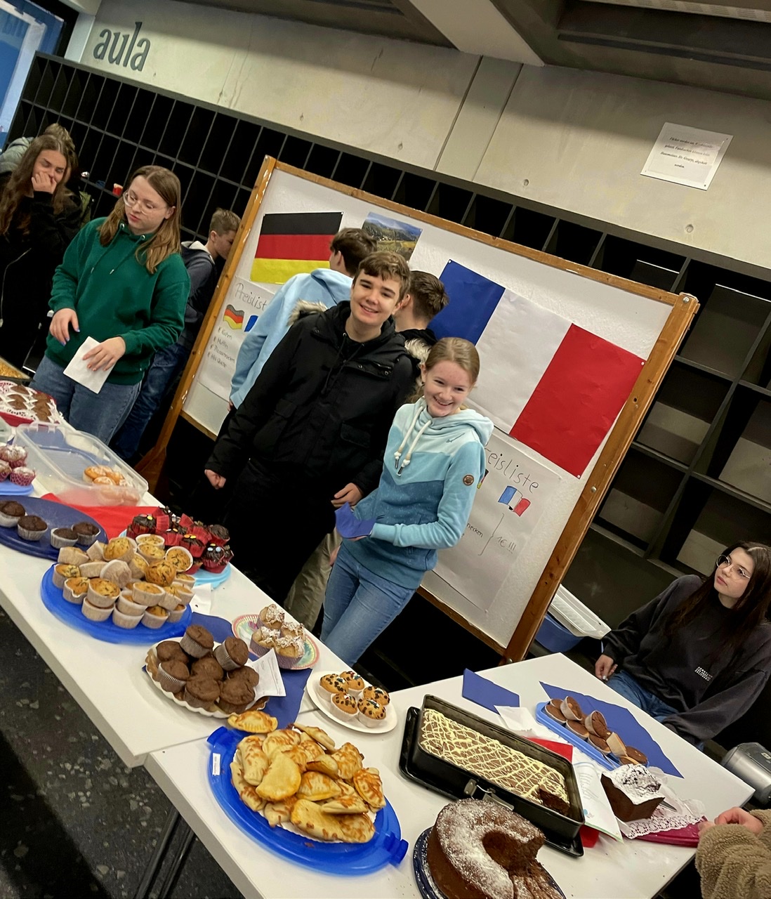 „Vive la Freundschaft!“ war für einen Tag das Motto an der Schule. Französische und deutsche Flaggen schmückten das Schulhaus – wer wollte, konnte sich auch in den Nationalfarben schminken lassen. In den Pausen wurde bei leckeren Kuchen und Muffins die deutsch-französische Freundschaft gefeiert. Der Erlös aus dem Verkauf der Leckereien kommt dem Sozialfond der Schule zugute, mit dem u.a. die internationalen Austausche unterstützt werden.