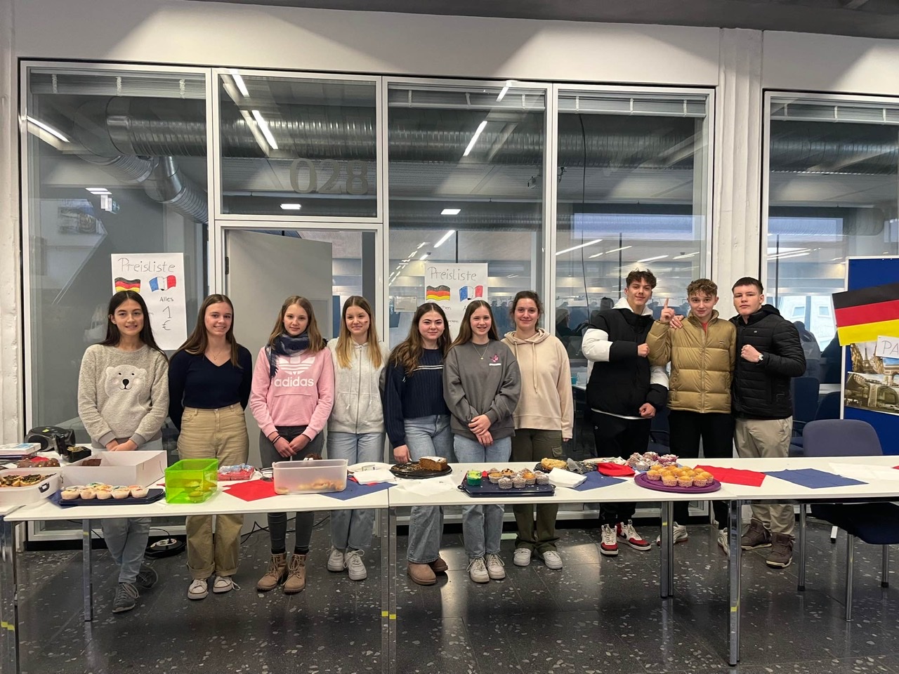 „Vive la Freundschaft!“ war für einen Tag das Motto an der Schule. Französische und deutsche Flaggen schmückten das Schulhaus – wer wollte, konnte sich auch in den Nationalfarben schminken lassen. In den Pausen wurde bei leckeren Kuchen und Muffins die deutsch-französische Freundschaft gefeiert. Der Erlös aus dem Verkauf der Leckereien kommt dem Sozialfond der Schule zugute, mit dem u.a. die internationalen Austausche unterstützt werden.
