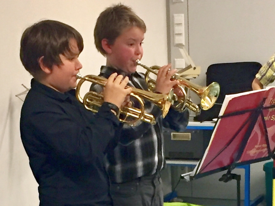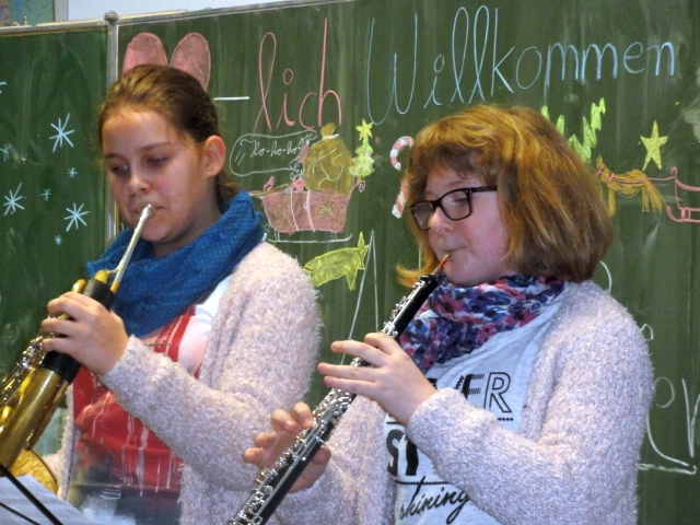 Mit „Morgen kommt der Weihnachtsmann“, vorgetragen von der Bläserklasse, endete die gemeinsame Feier. Die einzelnen Klassen gestalteten anschließend ihre Feier in den jeweiligen Klassenräumen mit eigenen Aufführungen und Beiträgen. Bei Gebäck und Kuchen gab es hier ausreichend Gelegenheit, sich bei Gesprächen besser kennenzulernen, bevor sich alle mit guten Wünschen in die Vorweihnachtszeit verabschiedeten.