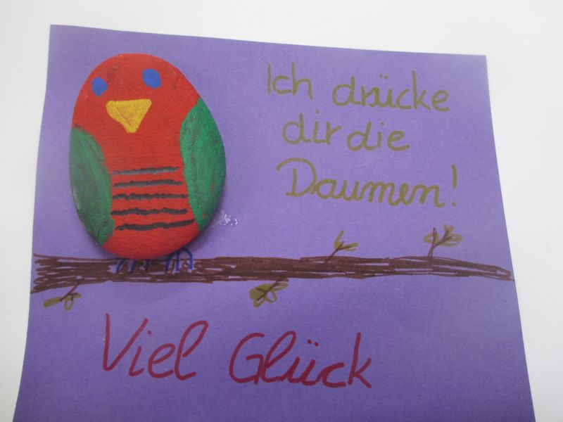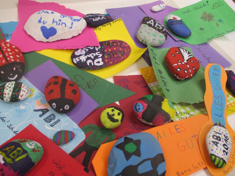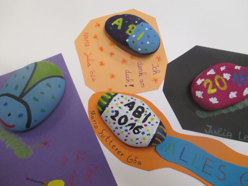 Die Fünftklässler haben in den vergangenen Wochen mit großem Eifer an ihren Steinen und den passend gestalteten Kärtchen gearbeitet. Es entstanden wunderschöne bunte Steine mit Mutsprüchen oder als kleine Tiere gestaltet, die als Glücksbringer durch das Abitur begleiten sollen. Auf den Kärtchen sind Sprüche wie „Du schaffst das!“, „Ich glaub an dich!“ oder „Alles Gute für dein Abi“ zu lesen, mit denen ein ganz persönlicher Gruß eines kleinen Schülers zu einem Mutmacher für einen großen Schüler werden kann.