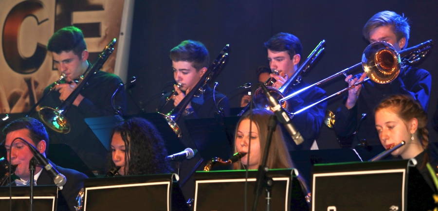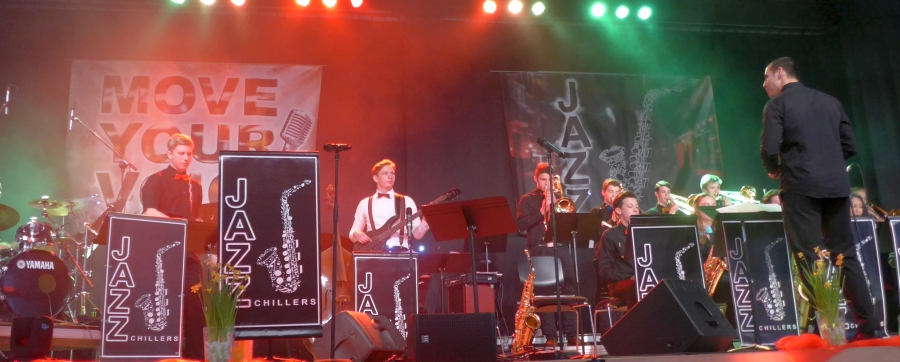 Big Bands an der Heimschule haben Tradition, die erste wurde bereits 1982 ins Leben gerufen. Seit 2003 heißt die Big Band der Schule „Jazz Chillers“, sie wurde von Christoph Breithack gegründet. Ganz besonders schwungvoll eröffnete diese Band das Konzert mit dem Stück „Play That Funky Music“. Die Musik kam hierbei nicht nur von der Bühne, sondern auch aus dem Zuschauerraum. Die beiden hervorragenden Solisten Lukas Andlauer (Trompete) und Cedric Lin (Saxophon) bewegten sich auf ihren Instrumenten spielend durch das Publikum, um sich auf der Bühne mit den anderen Musikern zur Big Band zu vereinigen. Die Zuhörer konnten in der vollbesetzten Aula bei „Switch in Time“ wirklich den Schalter umlegen, den Alltag vergessen und sich von der teils lässigen, teils sehr lebendigen Musik entführen lassen: mit „Moondance“ zu einem romantischen Spaziergang im Mondschein oder bei „Crazy Little Thing“ zu einem mitreißenden Rock`n Roll. Als Gesangssolist begegnete das Publikum hier dem ehemaligen Jazz Chiller Ruben Kilchling. Auch der Pariser Metro wurde mit „Straßbourg St. Denis“ ein Besuch abgestattet und man traf wieder auf die beiden Solisten Lukas Andlauer und Cedric Lin. Als weitere Solisten glänzten Mika Stelter (Posaune), Angel Saumer (Trompete) und Hannah Kollmar (Saxophon).