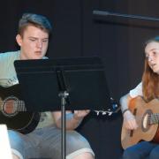 Es folgte die Gitarren-AG unter der Leitung von Werner Wittstock mit elsässischen Volksliedern und Hannes Waders „Heute hier morgen dort“, womit sie ordentlich Stimmung in die Bude brachte und zum Mitsingen einlud. Danach zauberte Violinistin Marie Wiedwald des Neigungsfaches Musik mit ihrem eindrucksvoll virtuosen und musikalischen Vortrag des berühmten „Czardas“  von Vittorio Monti den Zuhörern eine österreich-ungarische Kaffeehaus-Atmosphäre. Vom Schulorchester begleitet solierte und brillierte anschließend Marilena Jundt an der Solo-Violine mit dem Allegro aus Johann Sebastian Bachs berühmtem Violinkonzert in a-Moll. Dass es ganz tolle, flotte und reizvolle Literatur für „Klavier zu vier Händen“ gibt, stellten die Geschwister Simeon und Sarah Ziebold mit ihren spritzigen Vorträgen von „The merry boys polka“ von Suppé und „Jamaica Farewell“ unter Beweis. Einfühlsam beendeten sie ihren Vortrag mit der „Washington Post“ von John Philip Sousa. Als weiterer Höhepunkt des Programms ertönte das Allegro des Bratschenkonzertes von Georg Philipp Telemann. Die dunklen, warmen und virtuosen Bratschenklänge des Solisten Marco Zimmermann harmonierten hervorragend mit der strahlenden Begleitung der Orchester-AG.