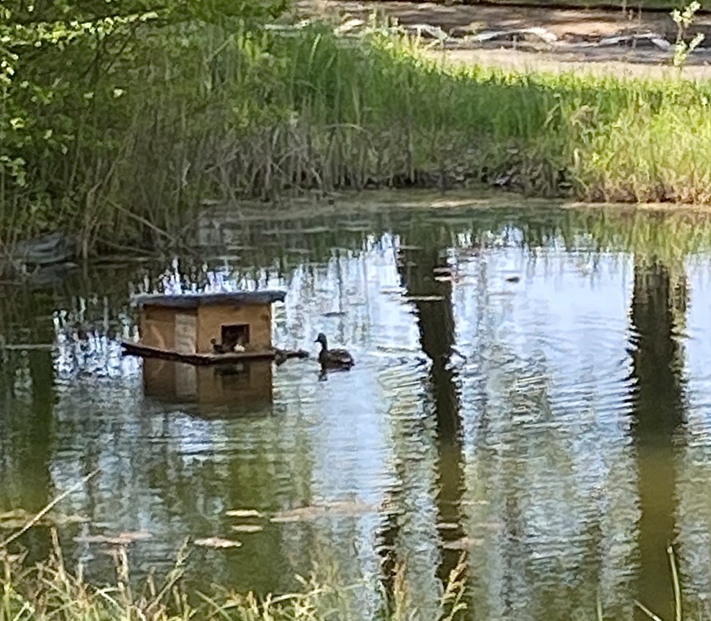 Auf dem Teich sind regelmäßig Stockentenpärchen zu finden, so dass die Idee aufkam, diesen einen Brutplatz anzubieten. Natürlich war nicht sicher, ob die Enten ihr neues Heim auch annehmen würden. Es schwimmt in der Mitte des Teiches, so dass es vor Nesträubern gut geschützt ist. Das sahen wohl auch die Enten so, denn plötzlich waren letzte Woche zehnkleine Küken geschlüpft und schwammen in einer wohl geordneten Reihe ihrer Mutter hinterher. Eine Stockente hatte, völlig unbemerkt von allen Beobachtern, ein Gelege in das dafür vorgesehene Haus gelegt und dort gebrütet.