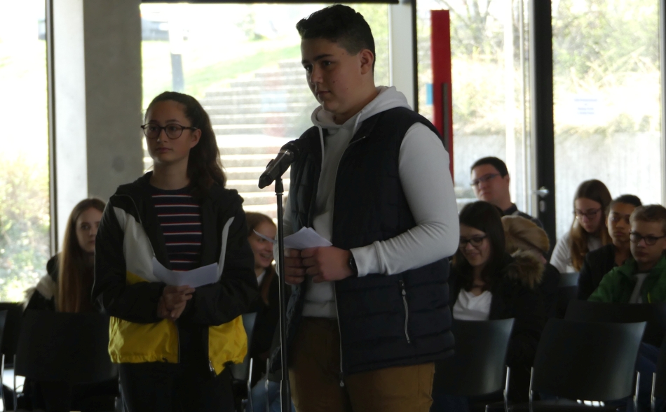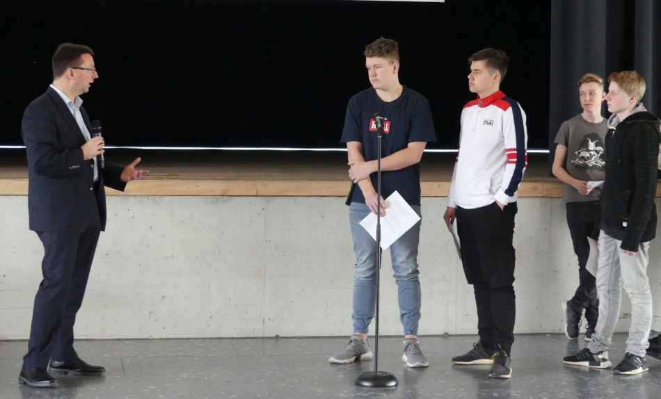 „In jeder Religion gibt es wunderbare Menschen und Schurken“, so das Resümee des Referenten, nachdem er zügig einen Rückblick über Formen des Rassismus und Antisemitismus gegeben hatte. Man dürfe sich von dummen und gewaltbereiten Menschen nicht einschüchtern lassen, niemand sei wegen seiner Herkunft oder Religion weniger wert als ein anderer Mensch. Ob er persönlich Antisemitismus erfahren habe, inwiefern Antisemitismus auch heute vorkomme und wie er damit umgehe, waren einige der Fragen, die von den Schülerinnen und Schülern an ihn gestellt wurden. Blume beurteilte die aktuell diskutierten Videos und Musik von Kollegah und Rammstein als „richtig krass“, die technisch gut gemacht seien, aber „wüsten Antisemitismus“ beinhalten. Allerdings zog er eine Unterscheidungslinie zwischen beiden, denn bei Rammstein sieht er auch Selbstkritik und das bewusste Spiel mit öffentlicher Aufregung und die Aufforderung zum Gespräch. Die Musikform des Rap sei aber immer Protestkultur, mit der auch Geschäft gemacht werde. Blume steht hinter dem Protest über die Echo-Vergabe im Jahr 2018, da es damals nur um Verkaufszahlen ohne jegliche Beachtung des Inhalts gegangen sei. Schlimm finde er auch, dass in jüngster Zeit schon zweimal die ehemalige Synagoge in Ulm Ziel von Angriffen geworden sei und jetzt Überwachungskameras nötig seien. Antisemiten und Rassisten richteten ihre zerstörende Wut immer gegen alles, was mit Bildung, Lesen und Respekt zusammenhänge. In Deutschland erlebe er auch, dass jüdische Kinder nicht mehr ihren Religionsunterricht besuchen, weil ihnen Angst gemacht werde. Er ertappe sich selbst gelegentlich bei Vorurteilen, wichtig sei aber der Umgang damit. Keine Schülerin und kein Schüler dürfe heute Angst davor haben, in die Schule zu gehen. Die Gesellschaft sei aus falsch verstandener Meinungsfreiheit heraus in jüngster Zeit gegenüber Rassismus zu nachsichtig gewesen. Wo Meinungsfreiheit aber in Hetze umschlage, müsse sich die Demokratie entschieden zur Wehr setzen. Als evangelischer Religionswissenschaftler, der mit einer Muslimin verheiratet sei, tritt er entschieden dafür ein, dass jeder Mensch seinen Weg zu Gott gehen könne, aber niemals Andere dafür verachten dürfe. Sein Appell an die Zuhörerinnen und Zuhörer war, sich von falschen Verschwörungstheorien, die sich im Internet zumeist gegen die jüdische Minderheit der Weltbevölkerung richten, nicht verführen, anlocken oder gar radikalisieren zu lassen.
