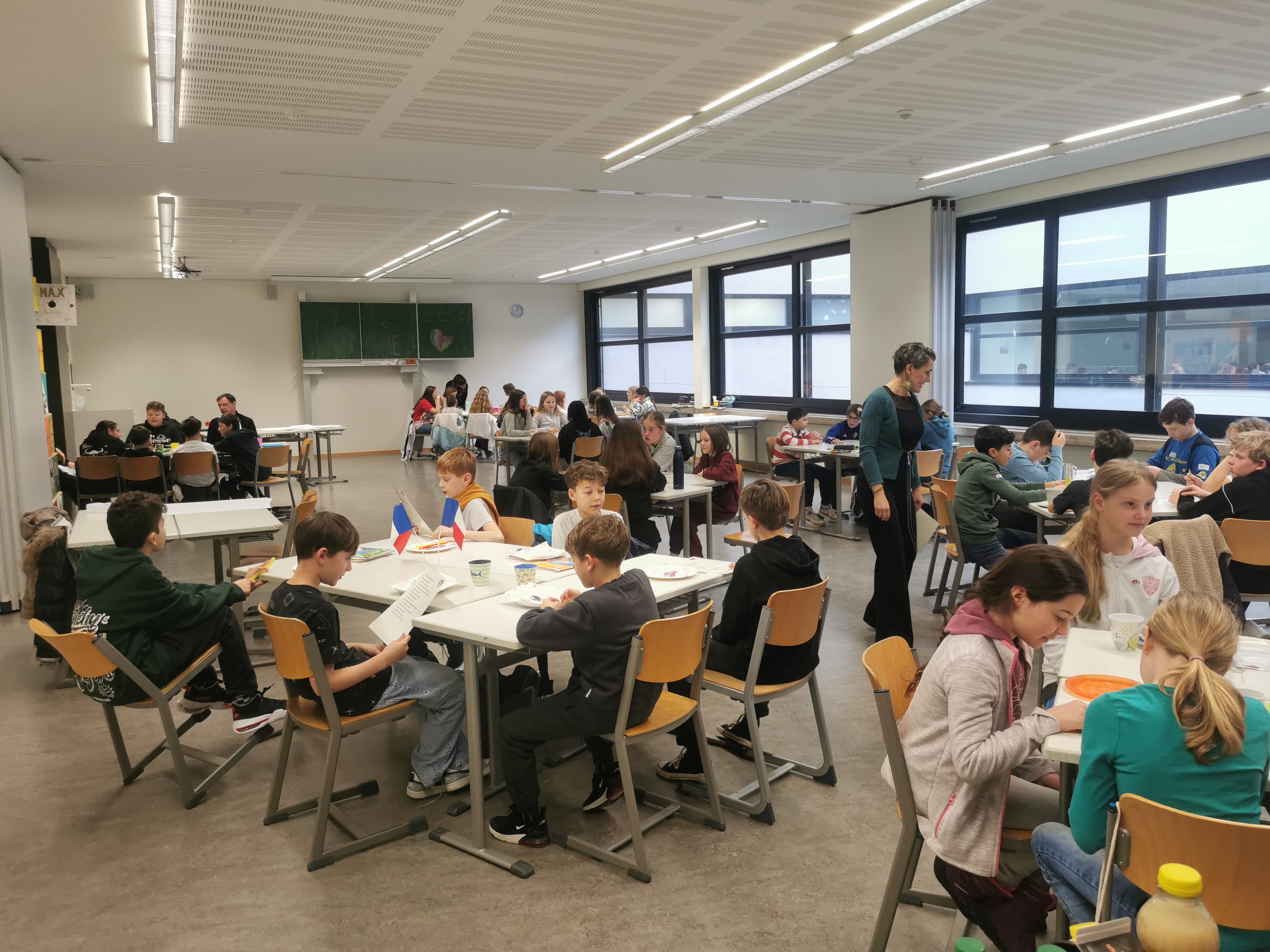 Die G6a berichtet über ihren Französisch-Austausch: Wir freuten uns schon alle sehr auf unsere Austauschpartnerinnen und -partner. Und am Montag, dem 18.3.2024, war es dann endlich so weit: Morgens haben wir das Klassenzimmer geschmückt und danach unsere französischen Austauschülerinnen und -schüler mit Plakaten und einem Lied empfangen. Nach der Begrüßung gab es ein Büffet und Spiele, die wir miteinander spielen konnten. Am Büffet gab es typisch deutsche Köstlichkeiten, die wir alle selbst mitgebracht hatten. Die Spiele waren dazu da unsere Austauschfreunde gegenseitig besser kennen zu lernen, uns miteinander zu verständigen und neue Wörter zu entdecken. Nachdem alle satt waren, sind wir zusammen zur Sporthalle gelaufen, um am geplanten Sportprojekt teilzunehmen, das Frau Ehrat geleitet hat. Dort haben wir verschiedene Arten von Völkerball gespielt, die uns allen sehr viel Spaß gemacht haben. Als der Gong zum Schulende geläutet hat, sind alle fröhlich mit den Austauschpartnern heimgegangen.